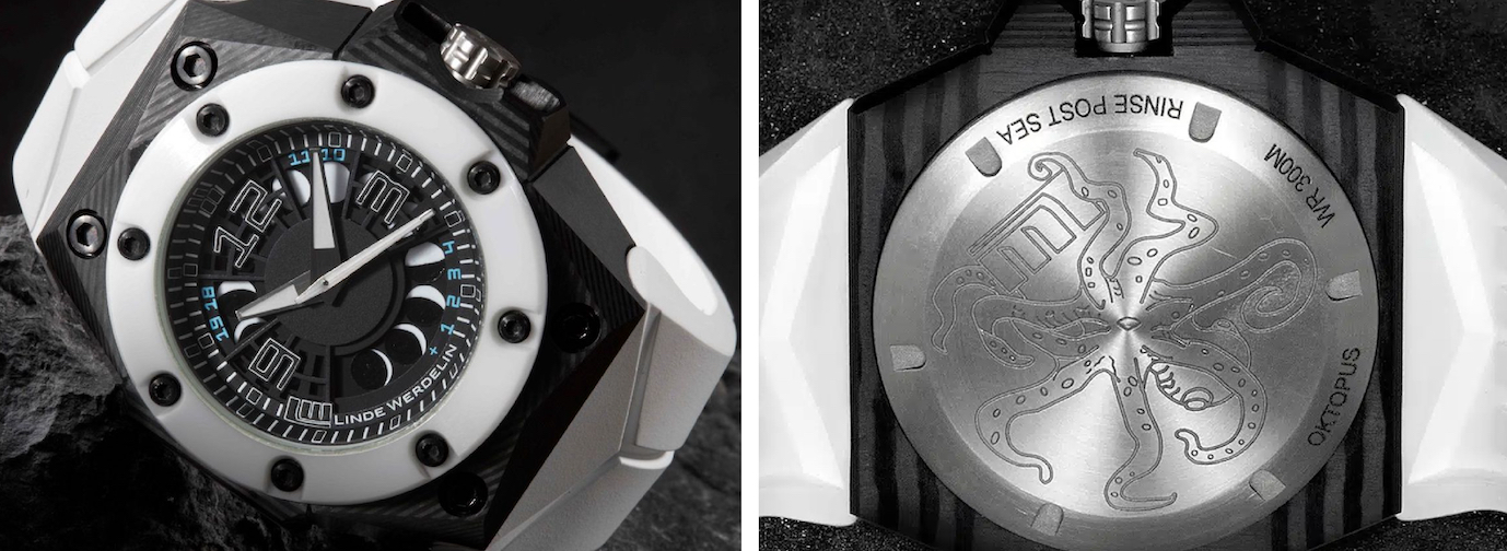 New version of Oktopus by Linde Werdelin with 3DTP™ case w.r. to m.300, white ceramic bezel, black link dial, white rubber strap and movement with Moon Phases on dial.