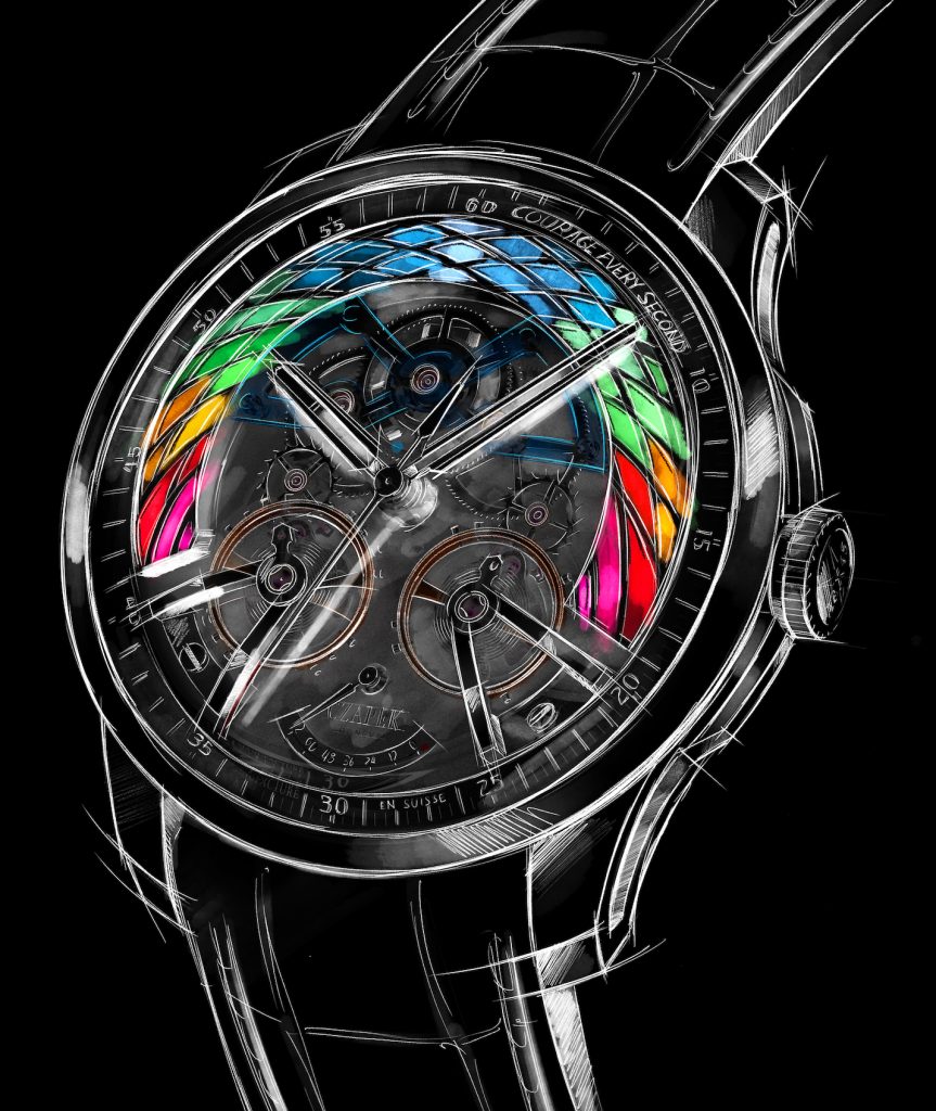 CZAPEK – La Marca ginevrina, nata nel 2016 per ricordare l’orologiaio polacco che è stato scio di Norbert de Patek, presenta mi versione colorata, Compicità, della collezione Place Vendome che unisce l’arte orologiera e quella degli smalti che sul quadrante riprende i colori di tutte le edizioni di Only Watch unendovi anche il verde. L’ispirazione è nata vedendo l’opera multicolore Hexa Grace di Victor sul toto del Palazzo dei Congressi di Monaco. La cassa in acciaio ha un ø di 41,8 mm. Gli smalti sulla fascia del quadrante sono stati realizzati in collaborazione con l’atelier Donzé Cadrans e c’è anche un altra frase da ricordare sul réhaut, il motto di Czapek: “Courage every second”. Il movimento Calibro 8 è stato realizzato in collaborazione con Bernard Lederer (da qui la definizione Complicità); la riserva di carica è di 72 h, ha l’indicazione della riserva di carica e un doppio scappamento con differenziale aperto, due ponti sono in zaffiro e ci sono sei elementi incastonati in oro. Il cinturino è in alligatore e la fibbia è in acciaio.
