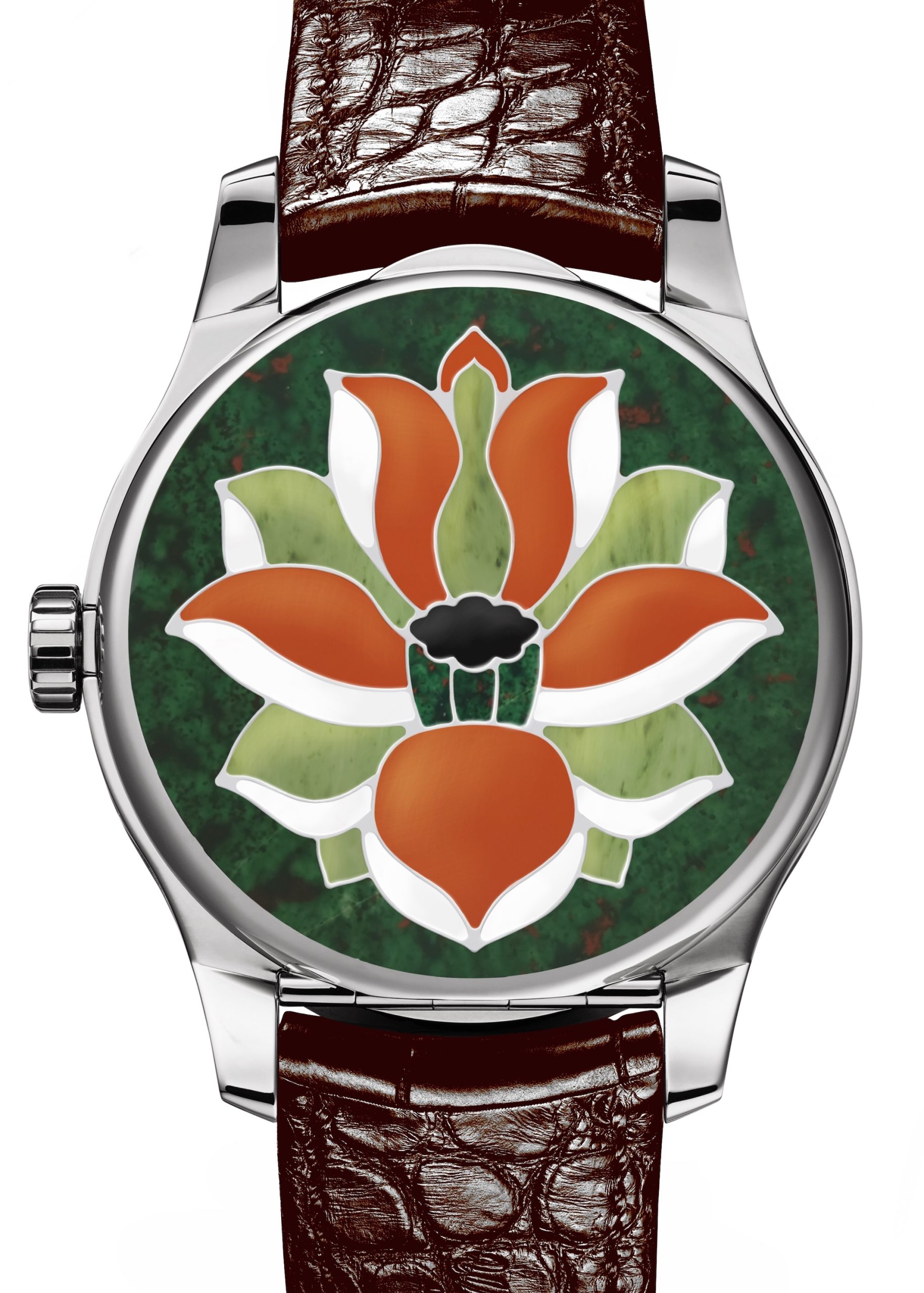 BARBIER MUELLER – Sul quadrante di Moosaique il fiore di loto è realizzato a mosaico con pietre di vario colore incastonate su un fondo bu-verde dall’abilità deil’Ateler Las Cadranier di Ginevra, azienda di proprietà di F.P.Journe che per questo orologio ha collaborato fornendo il suo movimento. a carica manuale Caliber 1304 in oro rosa (riserva di carica 56/58 h). La cassa ø 41 mm è in platino. ed è lavorata dall’altro atelier di F.P.Journe Las Boitiers de Genève.