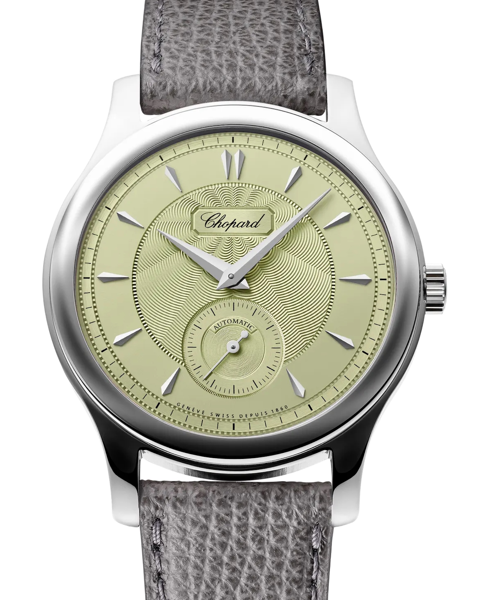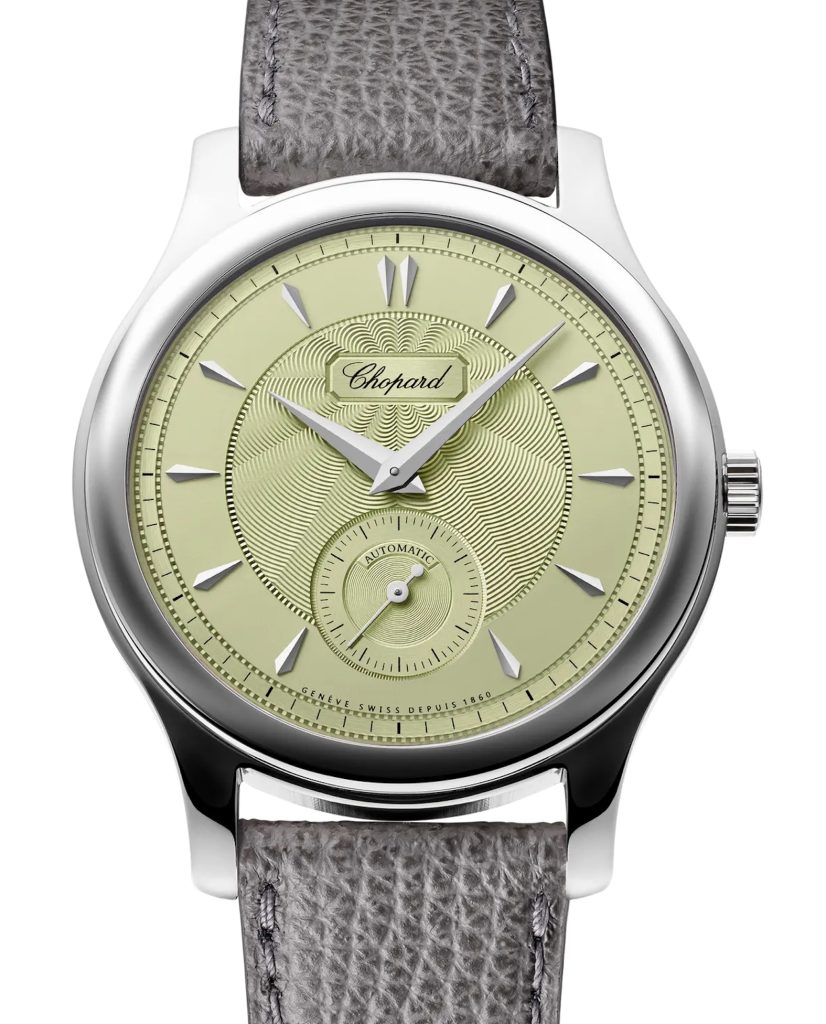 CHOPARD – L.U.C.1860 in questa versione ha una cassa in Lucent SteelTM, l’acciaio scelto per l’asta Only Watch. Questo modello è stato presentato nel 1997 e testimonia la passione di Friedirich Scheufele per la tradizione orologiera del Marchio acquistato dalla sua famiglia perché l’ultimo proprietario non aveva eredi. Il quadrante in oro si present con una raffinata tonalità verde è finemente lavorato al centro con motivo a guillochage. Il movimento è il Calibro L.U.C.96.40-L , evoluzione del precedente automatico con microrotore decentrato in oro e due bariletti secondo la tecnologia Twin di Choipard è certificato cronometro dal COSC. Il cinturino in pelle color antracite ha la fibbia in Lucent SteelTM.