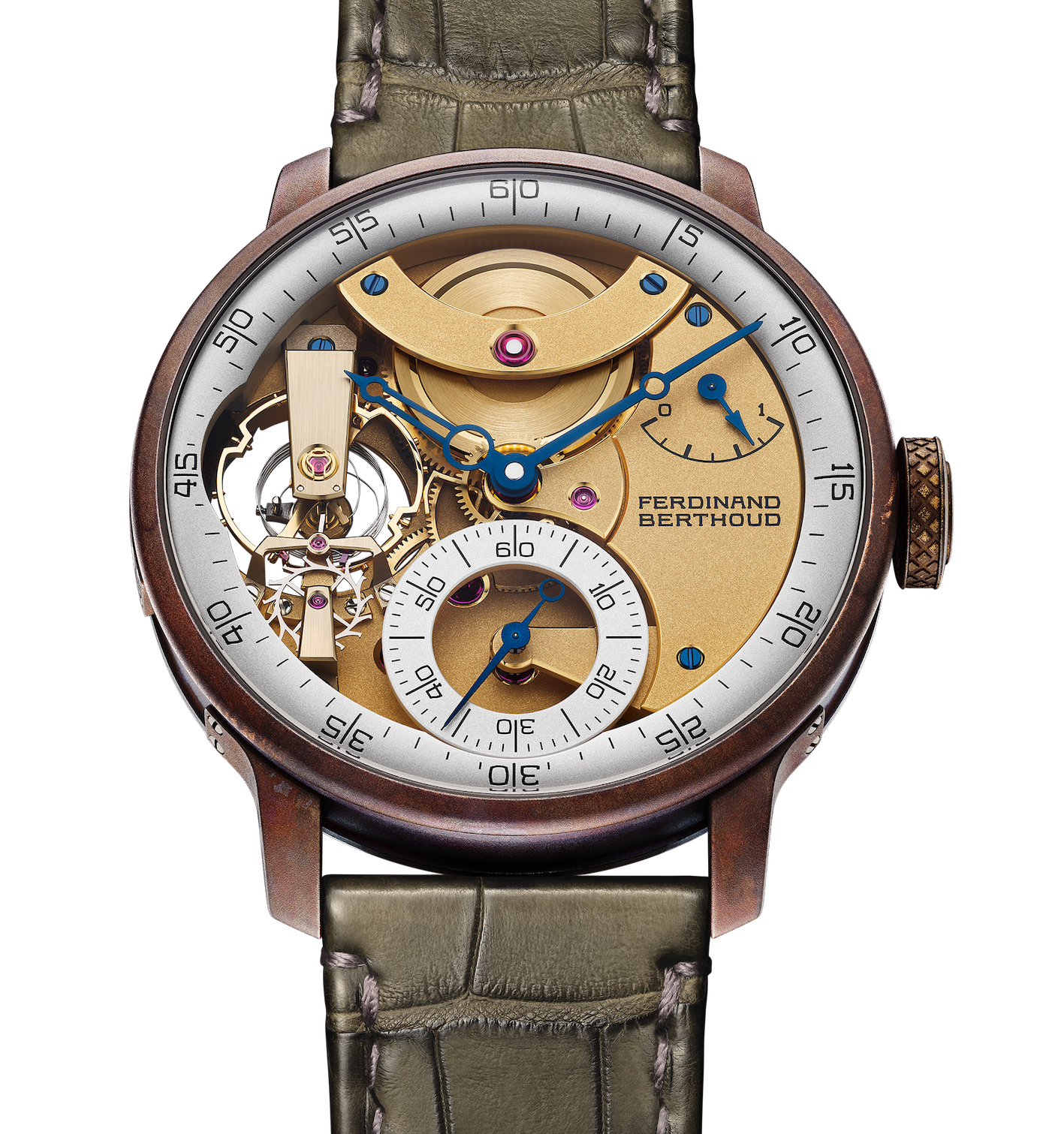 FERDINAND BERTHOUD – Il Chronometer FB3 per Only Watch ricorda anche un anniversario: nel 1753 infatti Ferdinad Berthoud ottenne il titolo di Maestro Orologiaio e in seguito diventò Orologiaio della Marina Francese per la precisione dei suoi segnatempo. Questa versione ha la cassa in bronzo patinato (ø 42,3 mm, spessore mm 9.43) che accoglie il movimento Calibro SB-SPC a carica manuale con bilanciere e spirale cilindrica. certificato cronometro dal COSC, riserva di carica 72 h. Il fondo della cassa è in titanio sabbiato; sulla corona in bronzo il logo FB. Sul bordo del quadrante réhaut di ore e minuti in ottone sabbiato argentato, color “guscio d’uovo”, quadrante dei secondi alle sei; i componenti visibili del calibro FB-SPC sono sabbiati e dorati (sfumatura 3N); le lancette di ore, minuti, secondi e della riserva di carica sono in oro trattate CVD azzurro. Due cinturini in alligatore marrone verde o in vitello marrone invecchiato; fibbia ad ardiglione in titanio sabbiato.