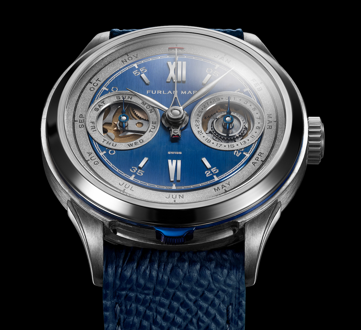 FURLAN MARRI – Questa Marca, fondata nel 2021 dal designer svizzero Andrea Furlan che ha lavorato per molti grandi Maison e dal collezionista e artista Hamad Al Marri, nel 2022i ha depositato un suo brevetto e oggi realizza 15 modelli per due collezioni; per quello destinato a Only Watch, il Secular Perpetual Calendar, al team si sono uniti anche altri Maestri da Dominique Renaud a Julien Tixier. La cassa in rodio placcato argento, ø 30 mm, accoglie il movimento G100 di La-Joux-Perret con massa oscillante in oro (24 rubini, A/h 28.800); il modulo del Calendario completo, brevettato, comprende 25 componenti, 5 sono quelli per il modulo secolare; lo spessore del modulo, realizzato in house è di mm 1,25; la platina in lega ARCAP èdirata un oro giallo. Le lancette lavorate sono opera di Dominique Renaud e le incioni sono di Coralie Mercier della Vallée de Joux, mentre Julien Tixier ha fatto manualmente la finitura di diversi altri componenti come le camme del calendario lucidate a specchio. Laurent Jolliet ha realizzato a mano il bracciale in maglia milanese d’argento, ma sono disponibili anche cinturini in vitello.