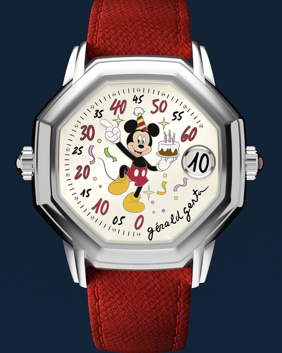 GERALD GENTA – È la prima volta che questa Maison partecipa a Only Watch r la scelta presenta molti ricordi storici. I personaggi di Walt Disney sono spesso apparsi sui quadranti, ma nei primi anni ‘Ottanta’70 Gerald Genta li sdoganò anche su esemplari di alta orologeria dotati di complicazioni. Sono passati molti anni e il Marchio, è stato venduto a Hour Glass e poi a Bvlgari, nel Gruppo LVMHi; oggi l’equipe GG, sotto la guida di Michel Navas e Enrico Barbasini, con la Fabrique du Temps – Louis Vuitton, ha voluto ricordare i Cento anni di Disney e i Cinquanta dell’orologio ideato da Gerald Genta. Sul quadrante insilato chamèòevÉ realizzato nella Fabrique du Temps da Nicolas Doublel, questo Mikey Mousre è un’immagine gioiosa di una serata che, con molti elementi, rende l’atmosfera di un compleanno. La cassa ottagonale in oro bianco, ø 40 mm, spessore mm 10,96con superfici satinate e lucide, è quella preferita da Gerald Genta che la impiegò per grand parte della sua produzione (e che tuttora troviamo in orologi attuali, ma che nascono proprio dal ricco patrimonio di disegni del grande Maestro.Il movimento è il Calibro di Manifattura GG-001 sviluppato e assemblato alla Fabrique du Temps con la supervisione di Michel Navas e Enrico Barbasini., carica 80 h. Tre le complicazioni: la Ripetizione minuti a due martelli con il cursore alle 9, quella delle ore saltanti che si vedono alle 3 e quella dei minuti a retrograde indicati dal braccio destro di Mickey Mouse. La carica è manuale con corona ornata da un rubino cabochon. Il cinturino in caucciù rosso ha la fibbia ad ardiglione in oro bianco.