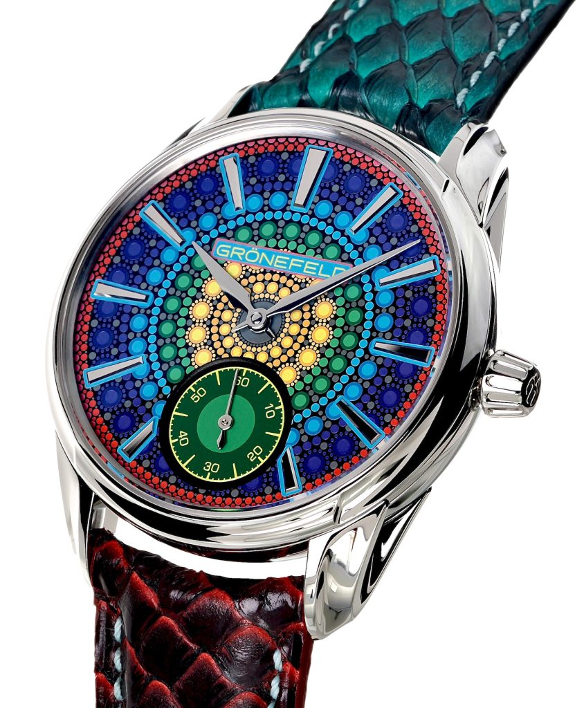 GRONEFELD – Gli Horological Brothers, Bart e Tim, per la prima presenti a Only Watch hanno scelto un modello della collezione 1941, Principia Mandala con cassa “Hunter” in acciaio (all’interno i loro nomi e quello del padre orologiaio, all’esterno il loro cognome e Only Watch 2023. Il quadrante ha un disegno Mandala il cui colore nasce da quelli dell’Asta; sono stati necessari 16 passaggi DI STAMPA prima di ottenere quello definitivo. Il movimento è il Calibro Grönefeld G-06 automatico rifinito manualmente, i ponti sono in acciaio, massa oscillante in oro 22 kt e castoni analoghi. Colorato anche il cinturino con fibbia con il logo.