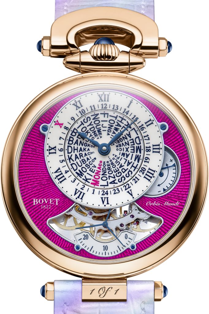BOVET 1822 – Con la tradizionale cassa con la forma di un orologio da Tasca tramutato in orologio da polso, anche questo ‘Hora Mundi” segue la tradizione instaurata per le precedenti Aste OW, quella del colore. Quest’anno è stato scelto un rosso particolare formato da un mix dei colori di OW, blu, verde, giallo, rosa e magenta. Quest’ultimo domina in quanto simbolo di benevolenza, armonia, sostegno e amore. L’indicazione dell’ora universale infatti è intesa come un invito a tutti i popoli non solo ai viaggi ma anche a una conoscenza reciproca allargando gli orizzonti della propria vita. Il quadrante, lavorato a gjuillochage, è ricoperto da sette stati di lacca magenta applicati manualmente, poi fatti cuocere nell’apposito forno e infine accuratamente lucidati. Al posto del fuso orario di Ginevra è stato indicato quello del Principato di Monaco e la X per le ore, nello stesso colore, ricorda la decima edizione di OW. Un’apertura consente di vedere in funzione il bilanciere e l’organo regolatore, alla sua destra l’indicatore della riserva di carica (7 gg). La cassa, ø 42 mm è in oro rosso e la corona, ornata da uno zaffiro a cabochon, è posta alle 12. Il movimento a carica manuale, le cui funzioni sono regolate tutte dalla corona, è stato realizzato all’interno della Manifattura.