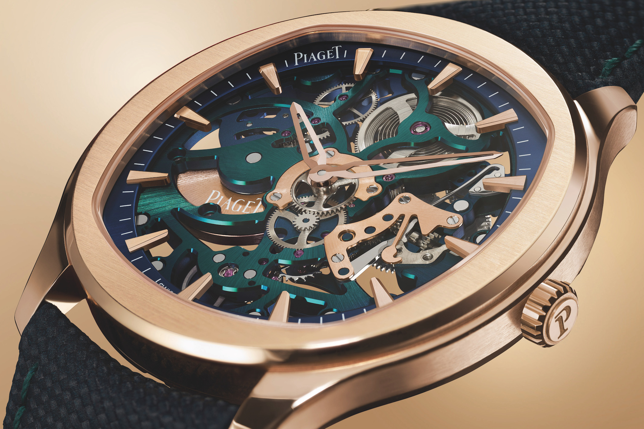 PIAGET – Da sempre presente a Only Watch la Maison ginevrina ha scelto il suo iconico modello Polo in veste Skeleton Arty, con il Calibro ultra-thin di Manufattura 1200S1 (solo mm 2,4 di spessore, carica automatica riserva di carica 44 h) i cui ponti sono stati colorati in oro blu, verde e rosa. La cassa a cuscino, ø 42 mm e spessore mm 6,5, è in oro rosa con il fondo in vetro zaffiro. sul quadrante blu oltre agli indici e alle lancette in oro rosa anche il logo Piaget. Due i cinturini in vitello blu e verde con decorazioni alternative, facilmente intercambiabili.