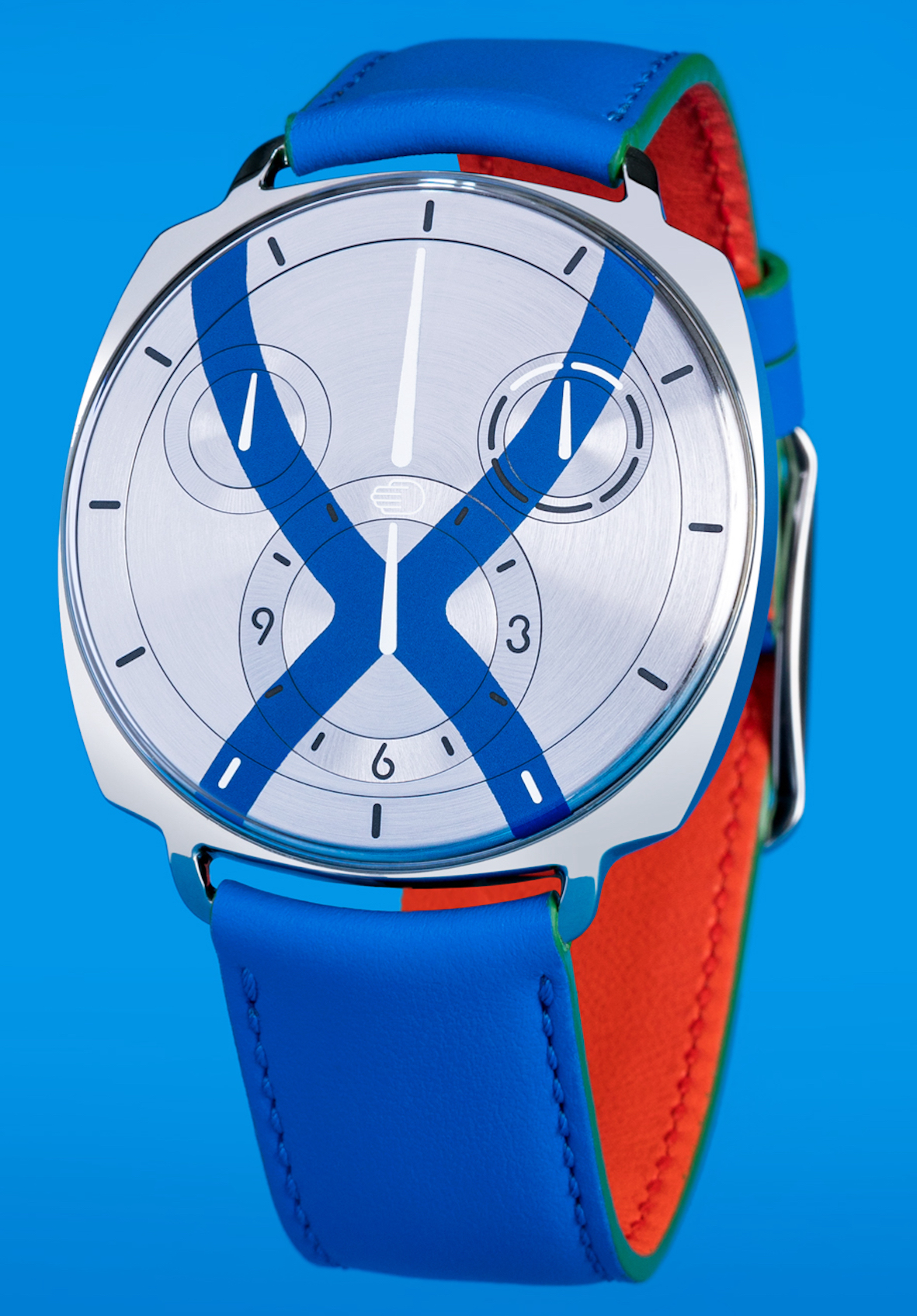 RESSENCE – TYPE 12 è un modello particolarmente allegro e non solo per la scelta dei colori.Il suo movimento brevettato deriva dal ROCS 1.3 e impiega il sistema Ressence Orbital Convex. Su base ETA 2892 un modulo apposito mette in funzione i minuti; la carica automatica e la regolazione del giorno e dell’ora avviene sul retro; riserva di carica di 36 ore, A/h 28.800, 40 rubini.Sul quadrante in argento tre satelliti biaxiali sono inclinati a 3° (per le ore) a 4.75° (per i secondi e il giorno della settimana). La cassa in titanio Grado 5 è protetta da vetri zaffiro a cupola.