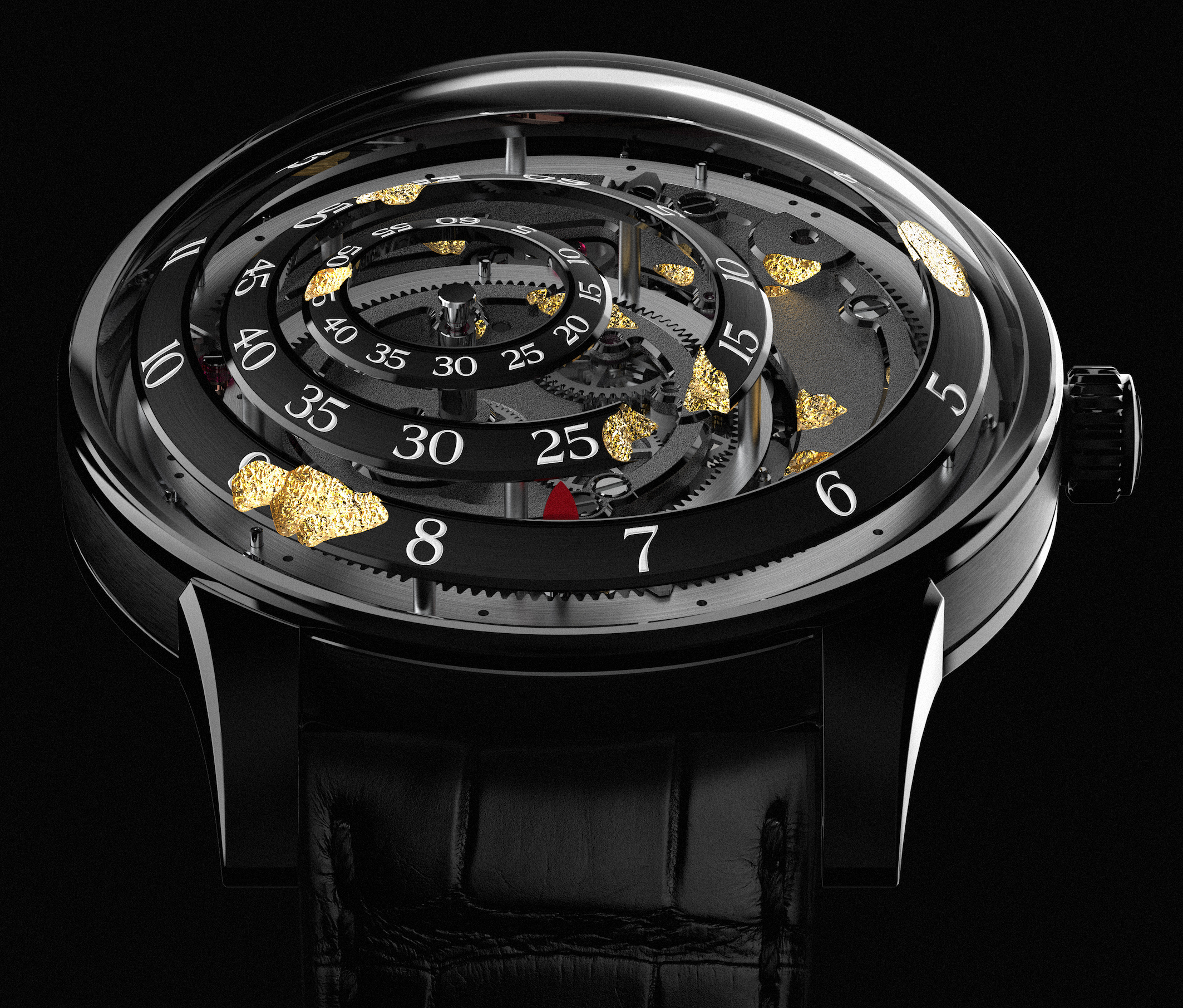 TRILOBE – Riconciliazione filosofia Kintsugi giapponese ha dato origine a un orologio Trilobe che nel modello per Only Watch ha voluto meter in risalto i tempi della vita con tutte le imperfezioni e in questo orologio alcuni componenti sono stati resi imperfetti dal Maestro Orologiaio che poi li ha ricoperti con foglie dorate (in Giappone gli oggetti preziosi che si rompono vengono riparati con l’oro).La cassa in Titanio Grado 5 trattata DLC , ø 40,5 mm, alterna superfici levigate e spazzolate; il fondo è in cristallo di zaffiro come la lunetta a cupola. Il movimento è il Calibro X-Centric calibre automatico dotato di microrotore, riserva di carica 48 h. 48 hours