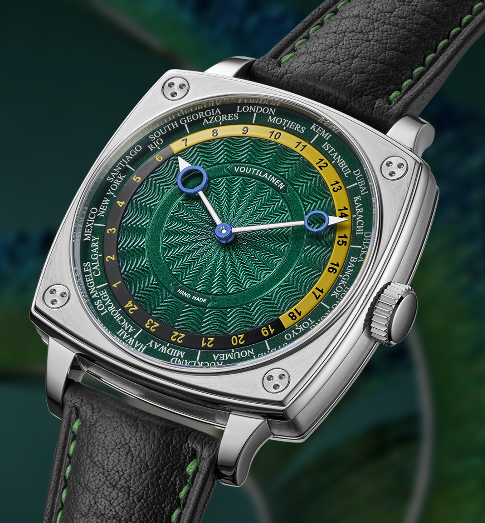 VOUTILAINEN – L’abilità del team del Maestro orologiaio finlandese appare soprattutto nella lavorazione del quadrante verde con base in argento massiccio lavorata a guillochage (con un centro a onde più piccole) sul quale si leggono le °Ore delle 24 grandi città del Mondo. La cassa a cuscino, ispirata dagli orologi da Tasca, è la prima con questa forma realizzata da questo Maestro orologiaio; ø 39 mm e spessore 12 mm, è in titanio on 4 viti sul fronte e altrettante sul retro. il movimento è il nuovo Calibro TMZ217 che cambia il fuso orario con correzione rapida premendo sulla corona. (A/ 18.000, rubini 44 e riserva di carica 60 h). Cinturino in pelle e fibbia in titano.