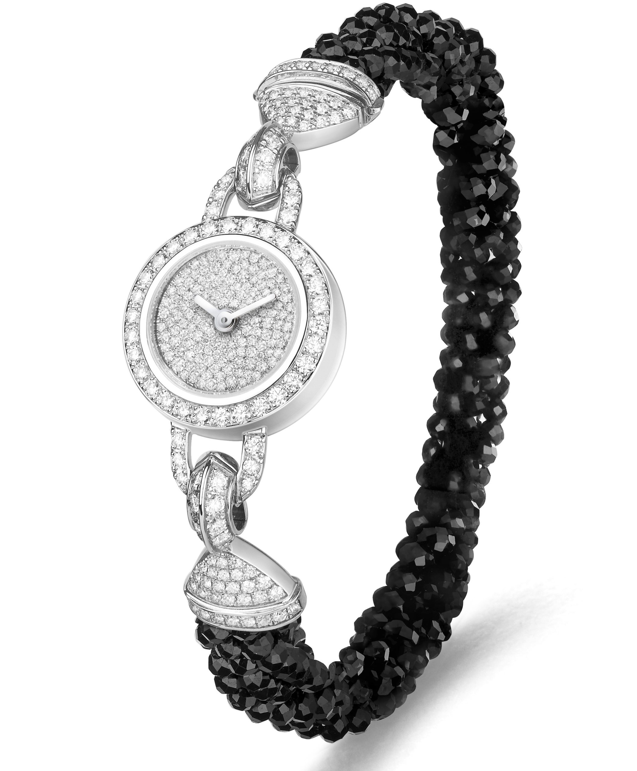 BOUCHERON – Il nome scelto, Joy de Lumière è perfetto per questo orologio gioiello in oro bianco e diamanti e spinelli neri chiaramente ispirato all’Art Décò. Sono più di 260 i diamanti incastonati su cassa, lunetta, anse e bracciale; il bracciale è formato da cinque file di spinelli intrecciati manualmente. Il quadrante, full pavé ha incastonato 142 diamanti. La cassa, ø 17,6 mm in oro bianco, ha il fondo in oro bianco sul quale sono incise le parole: “Boucheron»”, “JE NE SONNE QUE LES HEURES HEUREUSES», «Swiss Made» e “1/1”. Il movimento di questo orologio-gioiello che fa risaltare il savoir faire dei maestri di Boucheron. Il movimento al quarzo è il Calibro ETA E01.701/h3, che indica ore e minuti, non c’è la coronare non alterarne la linea filante e per regolare le funzioni basta premere un pulsante sul lato della cassa alle ore 10.30.