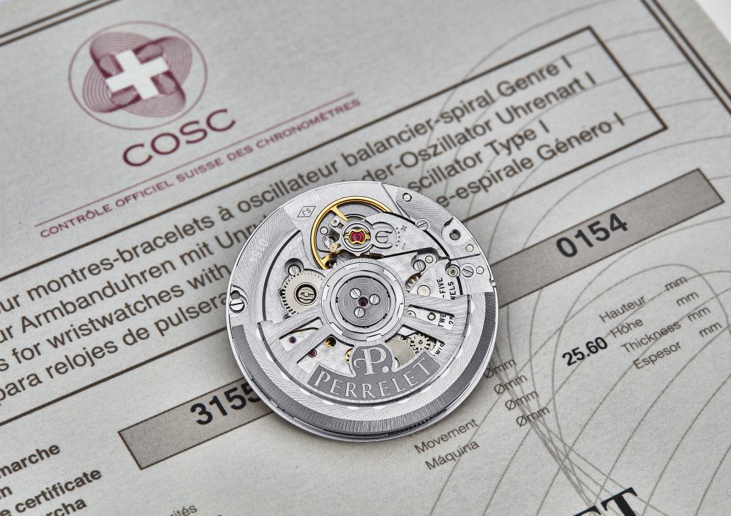 A testimoniare l’attenzione di Perrelet alla meccanica orologiera offrendo segnatempo di grande precisione, pubblichiamo anche il certificato del COSC che testimonia la cronometria del movimento; questo è sempre il Calibro P-331-MH automatico, progettato in house e realizzato da Soprod, che fa parte del Gruppo Festina. Oltre che al COSC anche Chronofiable ®.ha rilasciato analogo certificato.