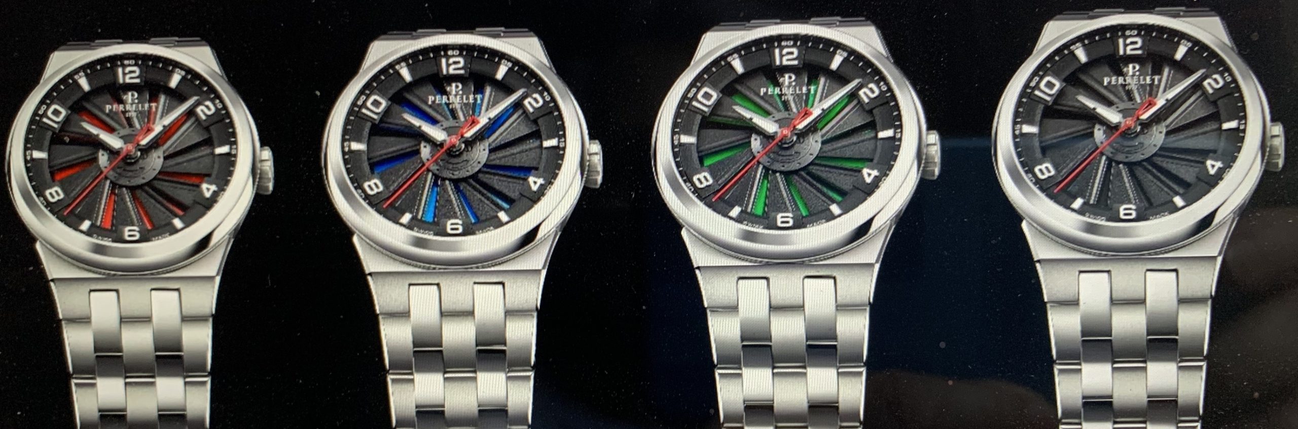 Le nuove dieci referenze che vedremo durante il prossimo G.W.D.; quattro con la cassa in titanio e il sotto quadrante blu, verde, rosso o nero con le 12 pale in alluminio anodizzato, sotto alle quali si trovano 5 contrappesi in tungsteno. Una novità è rappresentata dalle lancette a daga rivestite con materiale luminescente e sottolineate da un profilo nero e da un segmento orizzontale, che ne suddivide la superficie fra la base e la parte terminale.