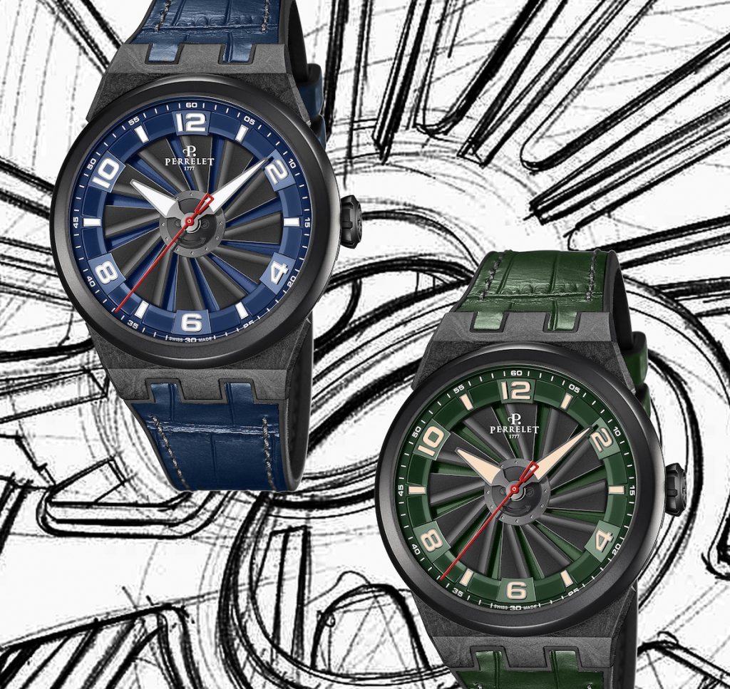 Del gioco che le pale svelano muovendosi sul quadrante, abbiamo scritto più volte, quello più malizioso l’abbiamo pubblicato in dicembre con il modello”libertino”, in queste c’è solo una scelta cromatica. Comunque In entrambi gli orologi il movimento è il calibro automatico P-331-MH, certificato COSC e Chronofiable (28.800 A/h, carica 42 ore e un’accurata rifinitura visibile dal fondello con oblò in vetro zaffiro) realizzato in Soprod, una delle aziende di Festina Group, gruppo internazionale che appartiene a. Miguel Rodriguez proprietario anche del Marchio Perrelet. La cassa rotonda ø 44 mm w.r.a m.100, è in policarbonato e fibra di carbonio, lunetta piatta in acciaio inossidabile con rivestimento PVD nero opaco.