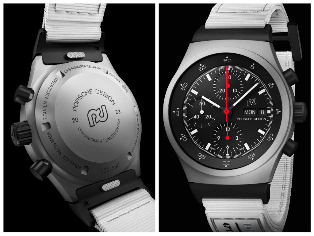 Il Chronograph 1 riprende esteticamente l’iconico modello del 1972, ispirato al cruscotto della Porsche 911, mentre per materiali e movimento è perfettamente aderente alla realtà attuale. La cassa, ø mm 40,8 w.r. a 10 ATM, è in titanio argentato, nera la lunetta con indicazione dei minuìi di cinque in cinque.