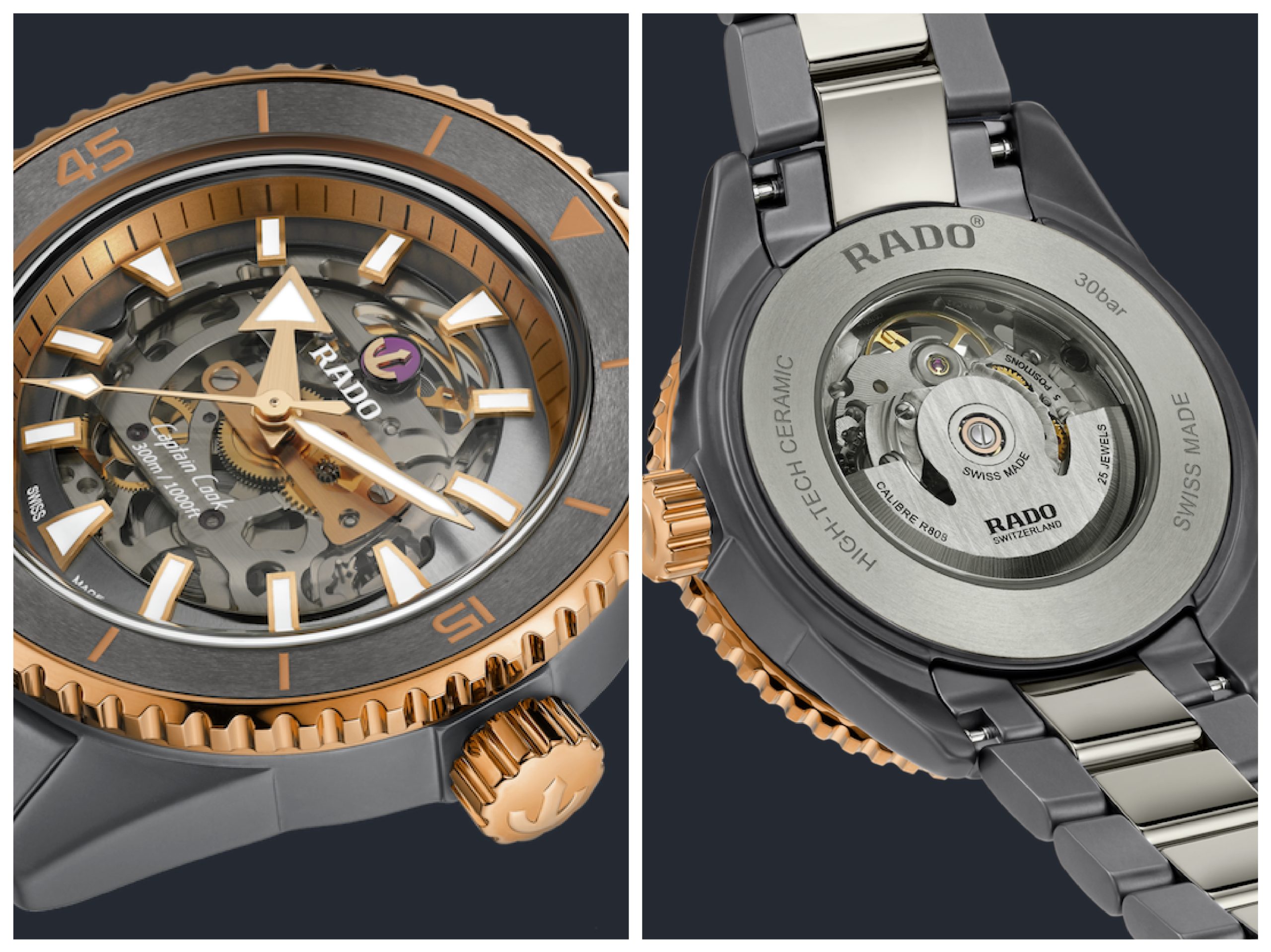 Per i nuovo Captain Cook è stata scelta la ceramica hi-tech al plasma particolarmente resistente ai graffi e ricca di sfumature antracite che si ritrovano anche nel bracciale. La cassa monoblocco (mm 43,0 x 49,8 x spessore 14,6) con finitura opaca, è w.r. a 30 ATM. I pulsanti sono in CeramosTM, la lunetta girevole ha un inserto in ceramica hi-tech al plasma satinato, tra la lunetta e il cristallo zaffiro sagomato, che presenta una leggera sfumatura fumé, un anello in colore oro rosa a contrasto. Anche il fondello in titanio è in cristallo zaffiro: sulla corona a vite il simbolo con l’ancora di Rado.