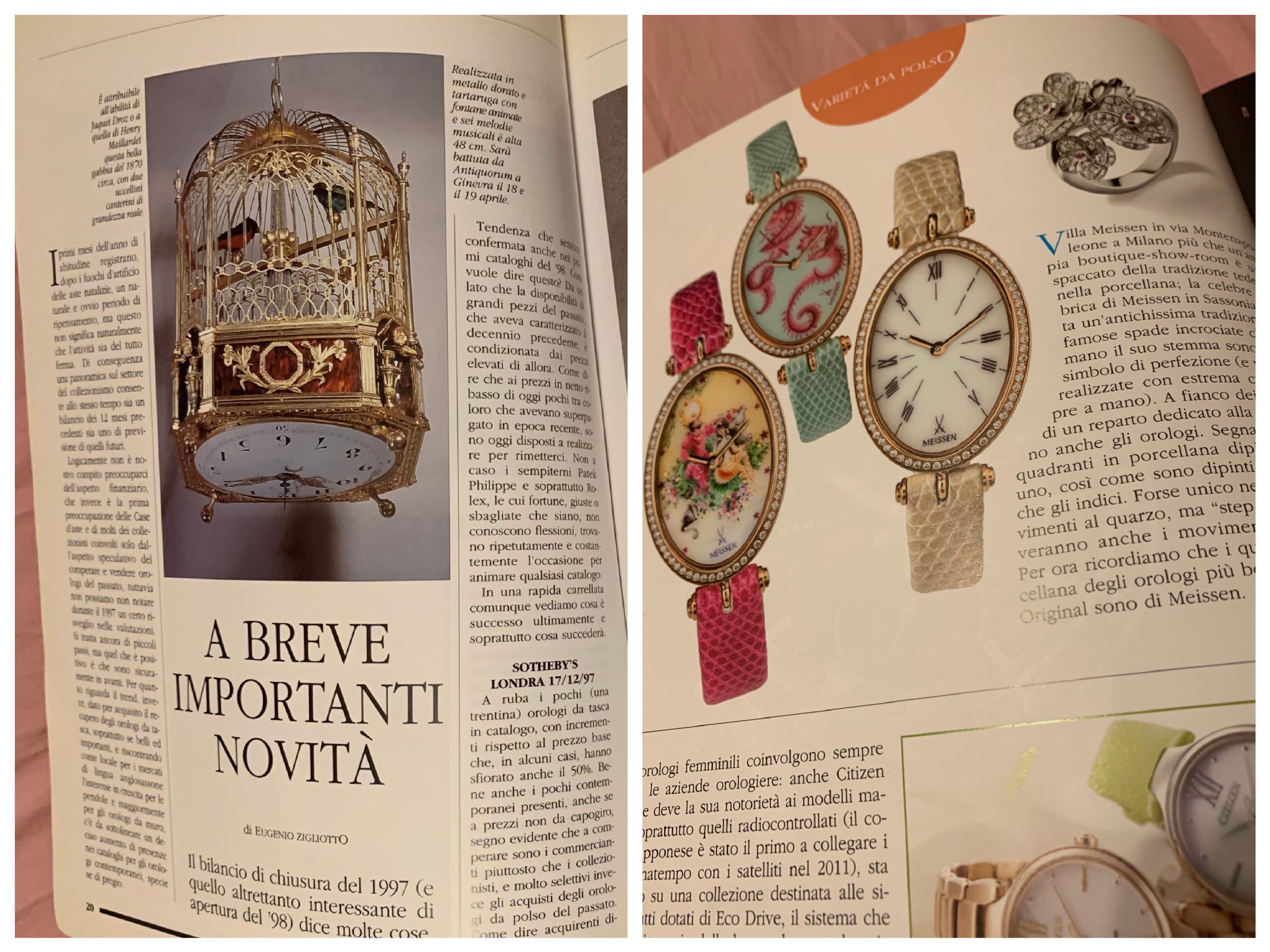 soloPolso naturalmente si occupa di orologi e se scriviamo della mostra milanese non è per campanilismo, ma perché la porcellana è stata impiegata anche in orologeria, soprattutto in passato e, nell’ambito dell’artigianato artistico anche adesso. Basterebbe ricordare molte pendole settecentesche francesi o quelle da tavolo, le cosiddette pendolate Dome, di Patek Philippe tuttora in produzione. Così, vogliamo portare un piccolo contributo all’impiego della porcellana anche negli orologi, pubblicando due foto dalla rivista Orologi da POLSO del 1999 e del 2012.