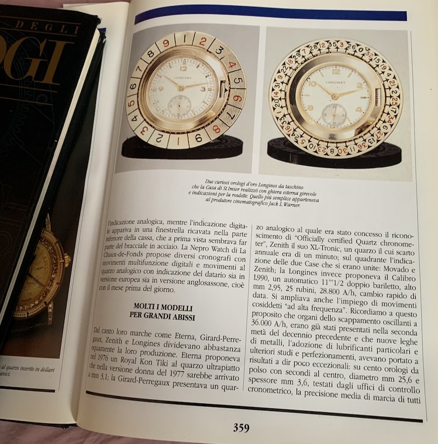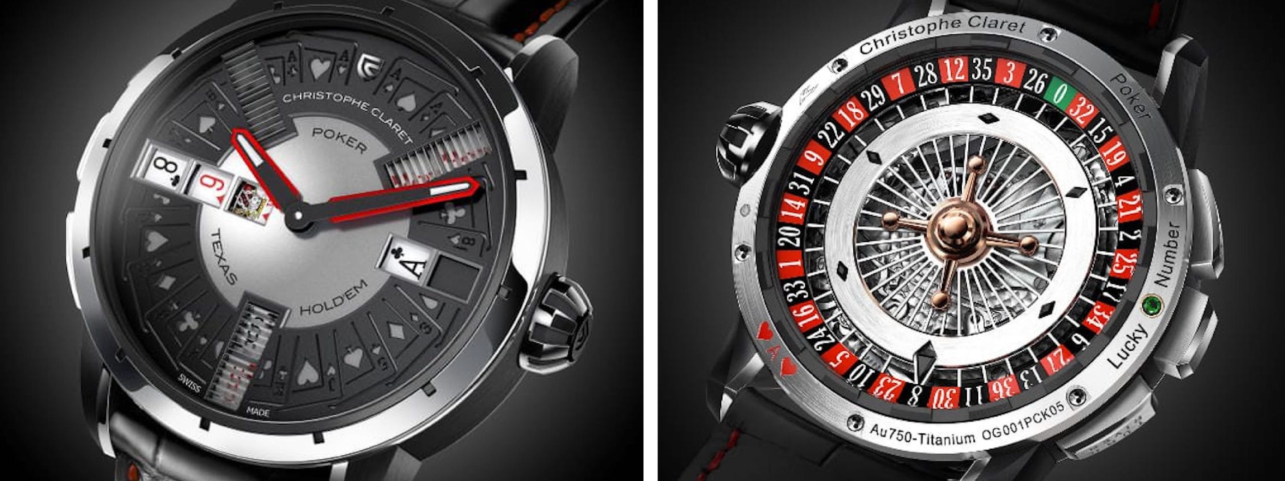 Per esempio di Longines, sull’Enciclopedia degli orologi da polso, pubblicammo due orologi roulette da taschino; quello a sinistra nella foto era di Jack L Warner della Warner Bros, entrambi con la ghiera esterna girevole adatta a funzionare come roulette. Più vicino a noi, gli orologi al quarzo di Pryngeps con la roulette sul quadrante e una pallina che ad ogni movimento del polso entra in uno spazio numerato e, nel nostro secolo, i complicati di Christophe Claret, Girard-Perregaux e Jacob&Co. Del primo pubblichiamo il Poker, coperto da brevetti in tutto il mondo, terzo orologio di una trilogia che comprendeva anche altri due complicati dedicati al Blackjack e al Baccarà; nel 2014 il Poker partecipo al Gran Prix d’Horlogerie Genève.