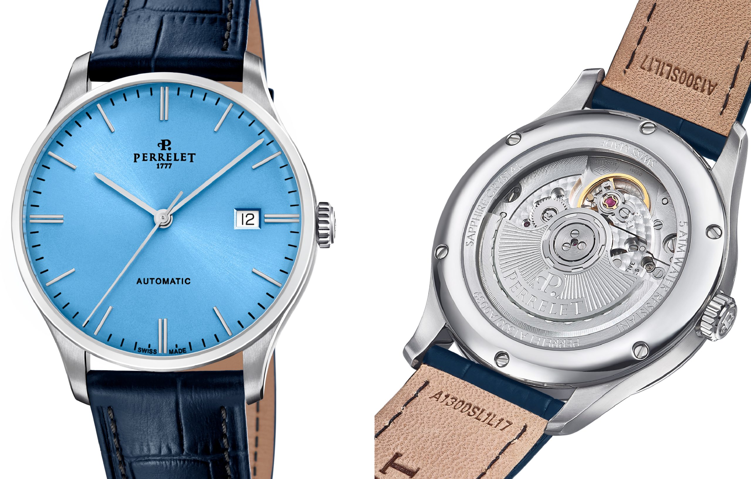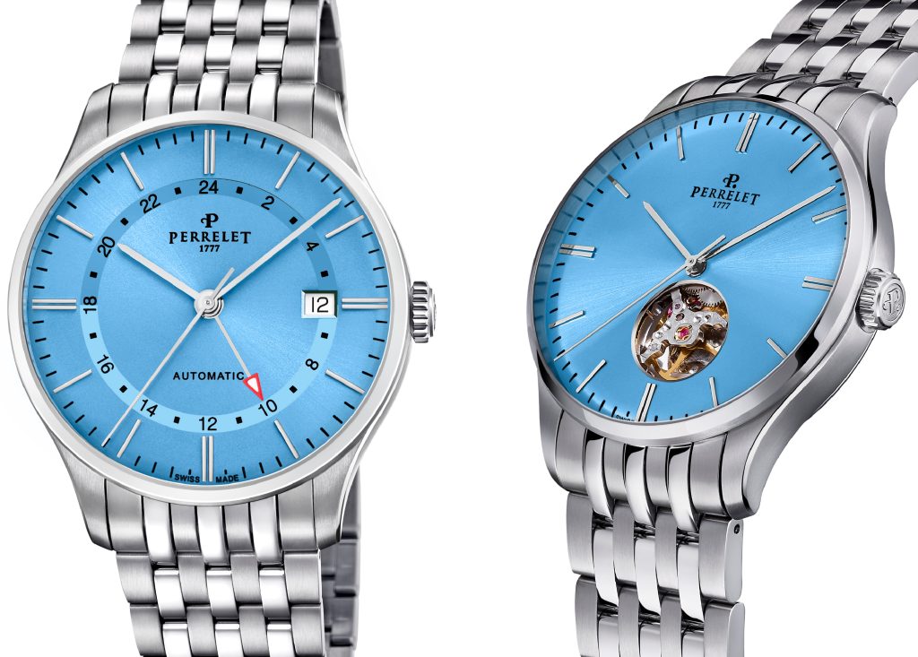 Per i tre modelli disponibili, tutti con cassa in acciaio ø 39 mm e vetro minerale sul fondello, quadrante bombato satinato soleil: si parte dal tre sfere con data per poi passare alla versione GMT con l’indicazione delle 24 ore su un cerchio opaco che risalta sulla lavorazione del quadrante e infine a quella più elegante, l’Open Heart con la finesdtrella a ore sei che mostra il bilanciere. I movimenti sono realizzati in Svizzera da Soprod che, come Perrelet, fa parte del patrimonio orologiero di Miguel Rodriguez, proprietario del Gruppo Festina..