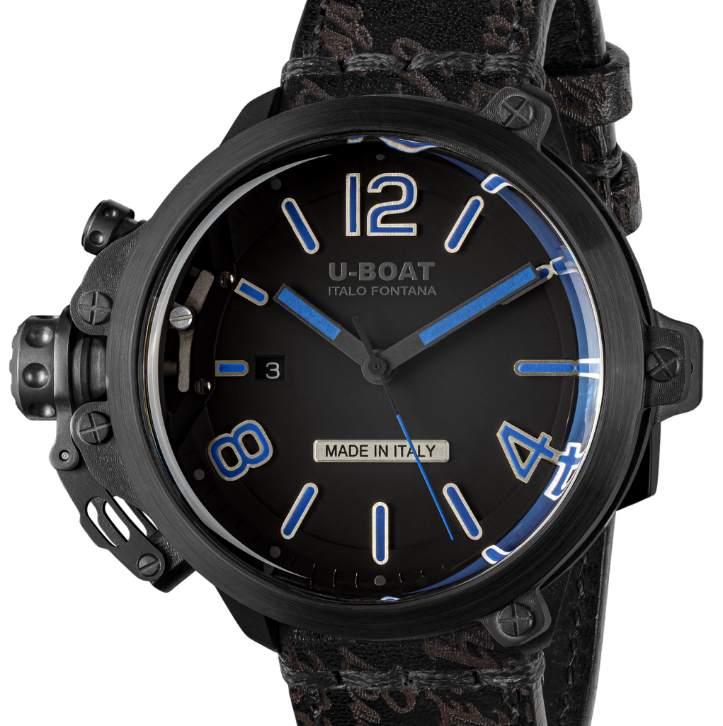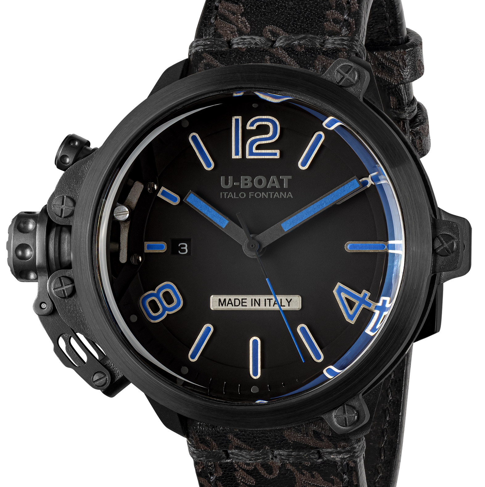 Oltre alla scritta “Made in Italy” orgogliosamente indicata sul quadrante, sul fondello chiuso è incisa la sagoma rotonda di un batiscafo di un lontano passato, le lancette sono luminescenti e l’estetica è quella classica che distingue gli U.Boat con corona protetta a sinistra. Il cinturino è realizzato in Toscana.