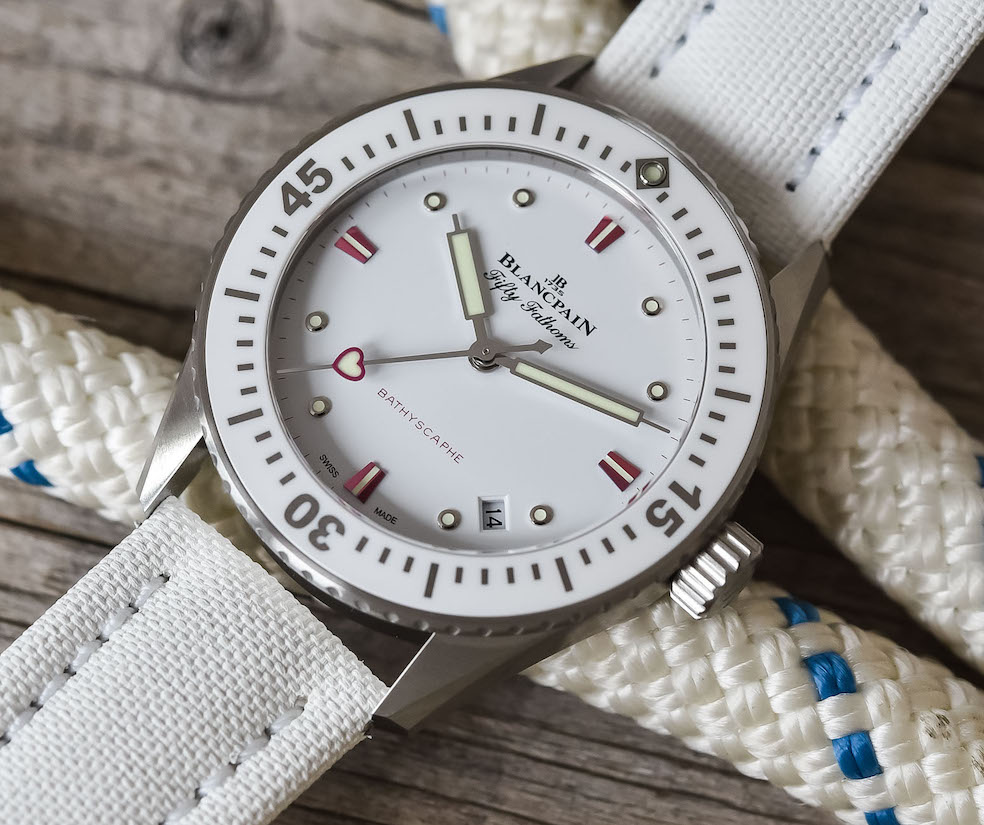 Per il 14 Febbraio il suo nuovo Fifty Fathoms Bathyscaphe, che nelle versioni per così dire normali, abbiamo pubblicato su soloPolso il 2 Gennaio, ha una proposta al femminile con quadrante bianco e un unico dettaglio rosso: il cuoricino, bordato di rosa sulla lancetta dei secondi. il movimento automatico è il Calibro di manifattura 1150, visibile dal fondello in vetro zaffiro. Solo 99 gli esemplari, per un selezionato pubblico .