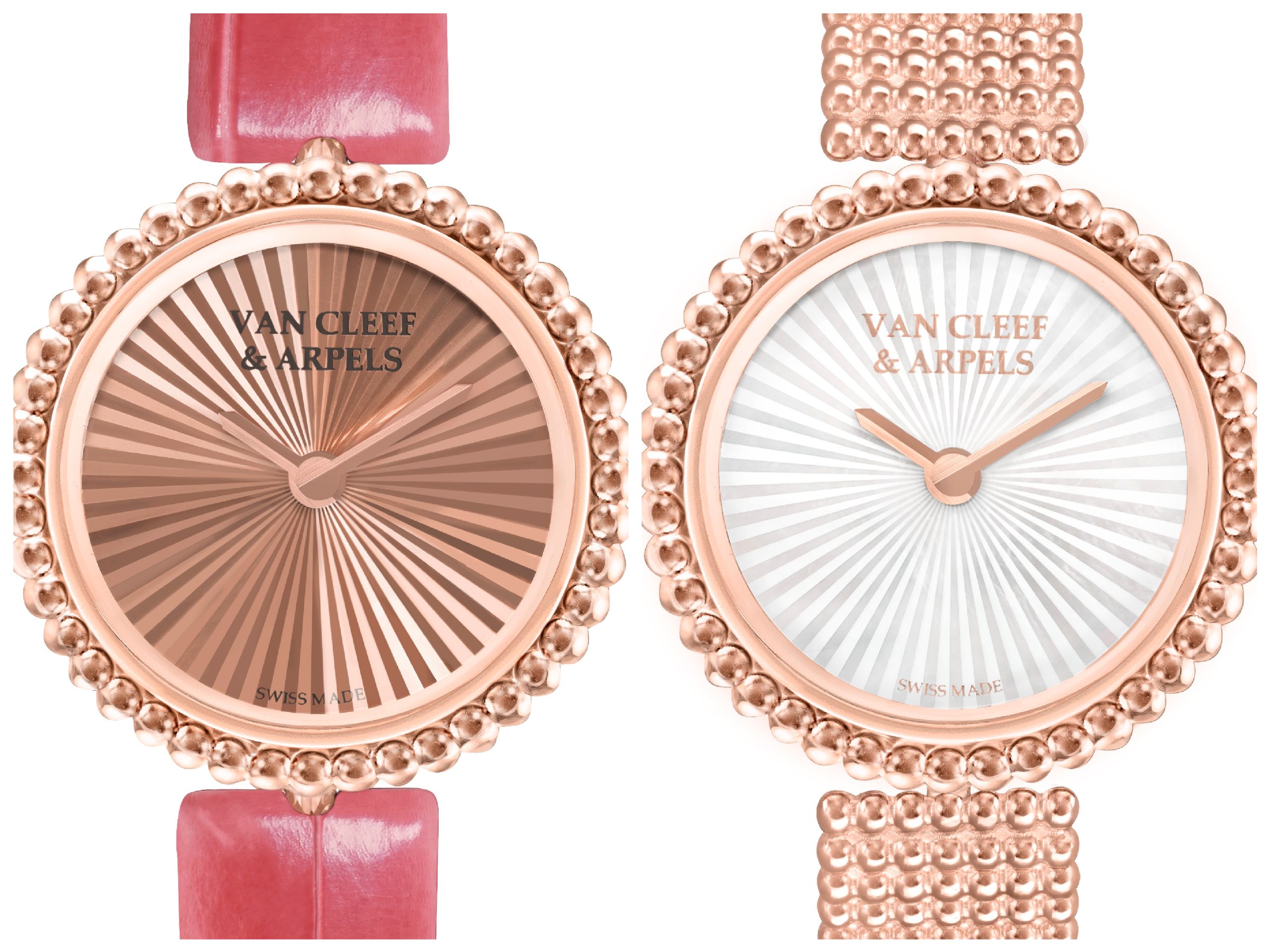 Golden pearls on new VC&A collection Perlée watches. Yellow or rose gold cases ø 23 or 30 mm, also for secret watches, pendentif with gold chaines or soft bracelets inspired to collection Toi et Moi. A big creativity either in watches or in jewellery fields.