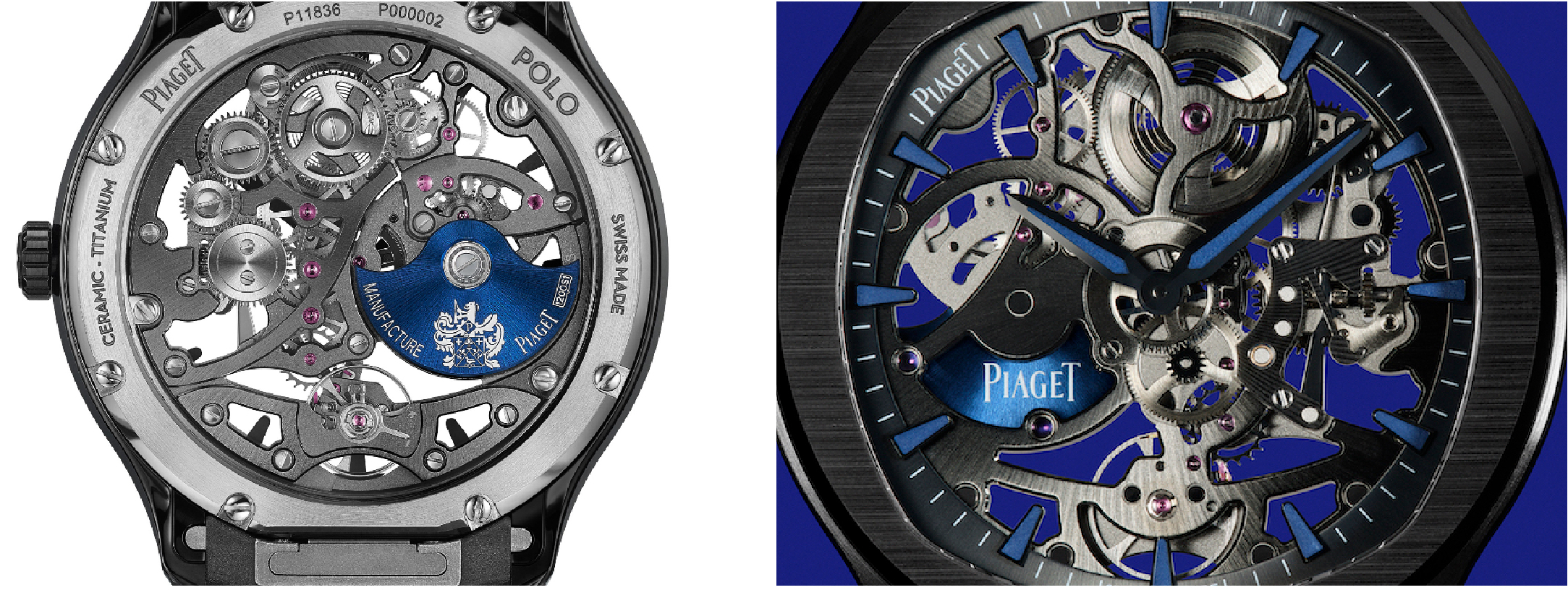 PIAGET POLO SKELETON CERAMIC. La ceramica viene impiegata per la prima volta dalla Marca elvetica e insieme alla cassa in titanio della nuova versione del Polo e al movimento scheletrato mette in risalto un aspetto inedito di questa collezione nata nel 1979 per lo sport del polo. Nel corso degli anni le proposte hanno visto spesso l’impiego di materiali preziosi, nel 2016 arrivò l’acciaio (la collezione PoloS fu completata con un nuovo movimento di Manifattura) e adesso ecco il titanio. Per realizzare la lunetta in ceramica di questo sottilissimo orologio, sono stati necessari studi e ricerche durate tre anni, ma il risultato mostra che ne valeva la pena perché l’orologio con la finitura nera della sua lunetta piatta ha un aspetto diverso, molto più attuale ed elegante. Nel 2021 il Piaget Polo Skeleton è stato dotato del Calibro di Manifattura 1200S1 (spessore mm 2,4 e riserva di carica 44 h) che sfoggiava nuove idee cromatiche per i suoi componenti e nel 2024 arrivò la versione ideata per Only Watch che, con ponti in diversi colori, ha posto le basi del modello attuale. il Piaget Polo Skeleton Ceramic si può indossare quotidianamente, anche se ha uno spessore di 7,5 mm, vale a dire 1 millimetro in più rispetto ai modelli Piaget Polo Skeleton in acciaio e in oro, grazie a un contenitore in titanio trattato PVD nero che accoglie la cassa ø 42 mm totalmente rinnovata e la lunetta piatta; sul quadrante lancette e indici sono in Superluminova. Un’altra prima da mettere in risalto la massa oscillante sulla quale spicca il logo della Maison. Infine i cinturini, facilmente intercambiabili, sono in caucciù nero con fibbia déployante in acciaio e titanio, o in caucciù blu.
