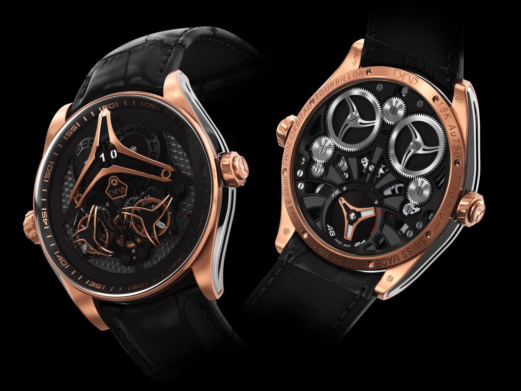 Sullo chassis rotante del quadrante si vedono gli indicatori delle ore/minuti su due dischi inclinati, i due tourbillon volanti con gabbie inclinate e ponti a forma di elica; particolarmente curata la decorazione e la scelta cromatica per attirare l’attenzione su vari componenti anche con l’emissione di luce al buio. Infine cinturino in coccodrillo nero cucito a mano con fibbia ad ardiglione di nuovo design, in oro rosa 4N con inserti in titanio grado 5, personalizzata con il logo Cyrus. La tiratura del Twin Orbital Tourbillon è limitata a 18 esemplari.