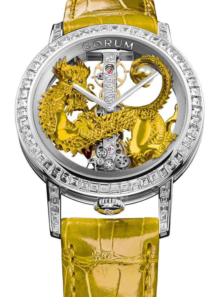 Oltre al Bubble, che abbiamo pubblicato nello scorso Dicembre, ci è giunto in seguito anche un Golden Bridge, con il celebre movimento ideato da Vincent Calabrese poi acquistato da Corum, che dal 1980 ne ha realizzato diverse versioni con casa rotonda o rettangolare. Il Golden Bridge Arowana. dedicato al Drago nel 2024 ha una cassa ø 43 mm in oro bianco impreziosita anche sulle anse e sulla lunetta con diamanti. Nel centro dell’orologio si vede un drago cesellato nell’oro che sembra abbracciare il movimento a baguette nel quale sono riuniti 190 componenti, sono in oro anche i ponti decorati artigianalmente. A quanto dichiarato da Boon Chong Soon, vice- présidente di Corum, questa versione è nata su suggerimenti dei collezionisti e inaugura un nuovo percorso negli orologi artistici della Marca.