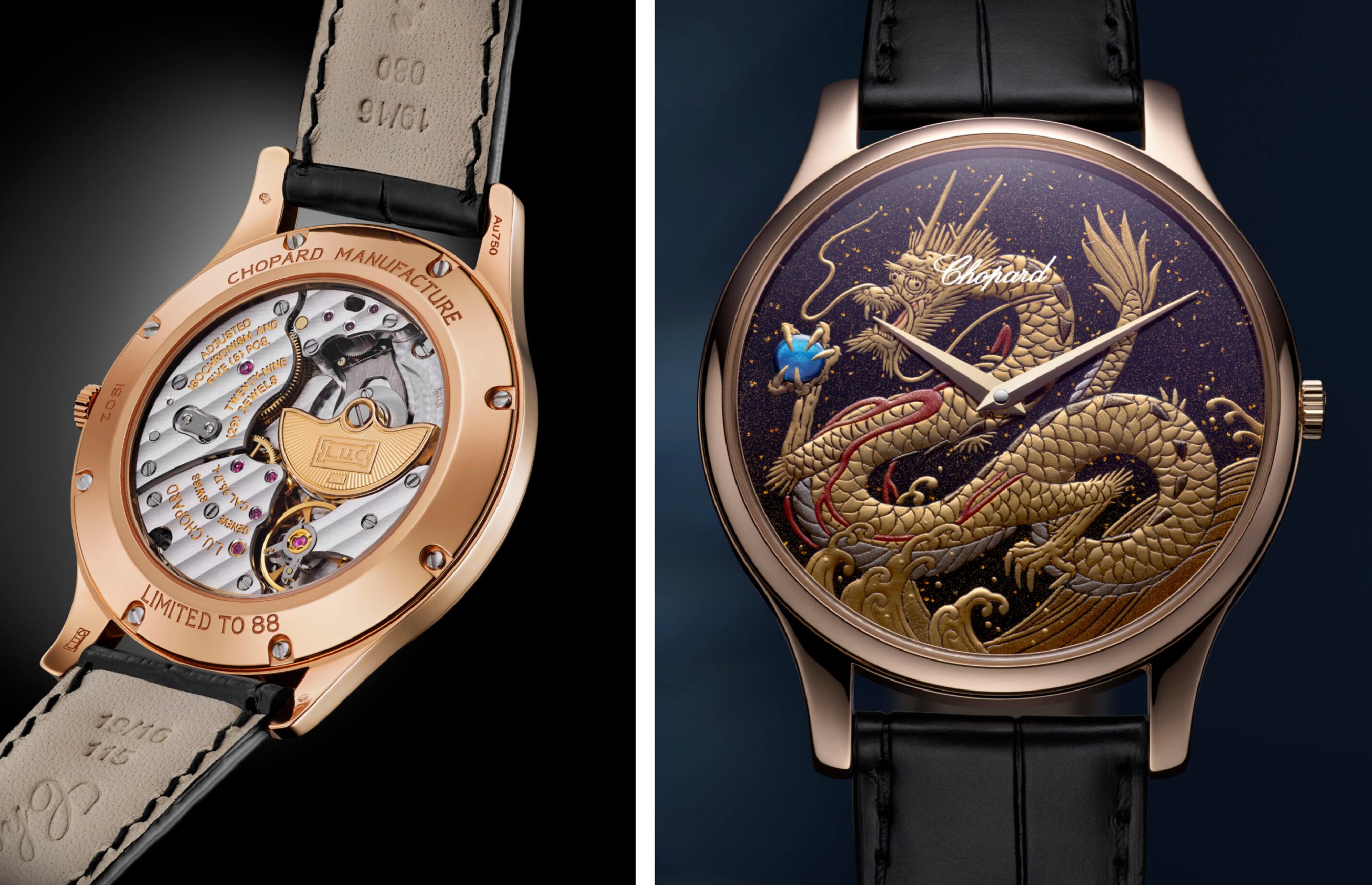A lacquered dial by a Japanise artist with traditional Urushi has been chosen for L.U.C.XP tribute to Chinese 2024 Calendar. Rose gold dragon with a pearl and a rose gold micro-rotor shown on the back. Only 88 watches in this limited edition.