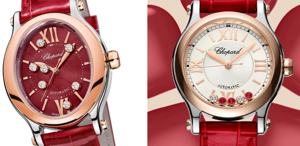 Da tempo disponibile nelle boutique della Maison e in negozi selezionati l’Happy sport con cassa rotonda ø 30 mm in acciaio e oro etico: dal fondo in vetro zaffiro si vede il movimento automatico realizzato appositamente per essere inserito nel contenuto spazio a disposizione. Sul quadrante ai diamanti si affiancano tre rubini, il loro colore rosso i riflettori anche sul cinturino in alligatore. Ancora più esclusivo un Happy Sport Ovale con sette diamanti che danzano sul quadrante rosso in madreperla con indici in oro rosa, corona che incastona un rubino e lunetta liscia o con pietre preziose; la cassa, sempre in acciaio e oro etico, misura mm 29 x 31,3 e il movimento automatico e il Calibro 09-01, visibile dal fondo in cristallo di zaffiro.