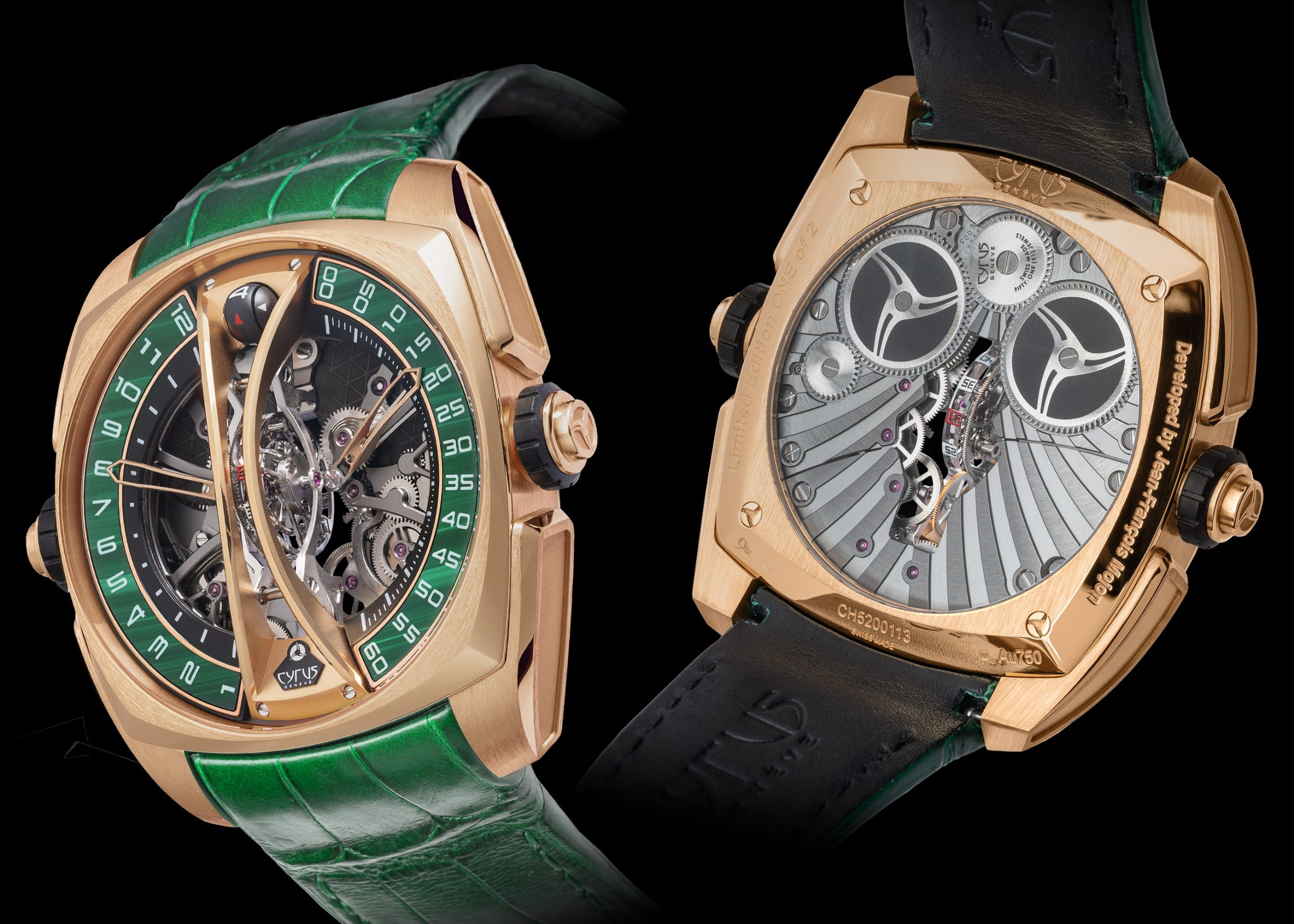 Oggi Jean-François Mojon, direttore tecnico di Cyrus Genève e creatore di tutti gli orologi di questo Marchio, ha aggiunto alla magìa dello scappamento a tourbillon verticale il fascino di un quadrante verde in malachite naturale dalle incredibili venature in tonalità differenti. Sotto il profilo orologiero da rilevare la gabbia del tourbillon al centro del quadrante su un asse verticale con un angolo a 90°, per cui in qualsiasi posizione ruotando in un minuto, è quasi sempre in posizione verticale rispetto al polso. In oro rosa e con cassa a cuscino w.r. a m 30, ø 44 mm (senza le due corone al 3 per regolare l’ora e caricare il movimento mentre quella al 9 con una leggera pressione corregge rapidamente l’ora), ha uno spessore di mm 19,9; sul bordo del quadrante ore e minuti sono indicati a retrograde, rispettivamente a sinistra e a destra; la struttura tridimensionale si presenta simmetrica dividendo lo spazio del quadrante in due parti uguali, accentuandone la profondità. Il ponte verticale arcuato, ispirato al ponte di Leonardo Da Vinci, è protetto da un vetro zaffiro bombato antiriflesso il cui spessore è di mm 1,2; la decorazione è particolarmente curata. La gabbia del tourbillon in acciaio, composta da 52 elementi svela un complesso ingranaggio di lancette e ruotismi. Nella parte superiore del quadrante scheletrato due i bariletti in parallelo, rodiati, decorati con cura artigianale e con un’incisione, consentono una riserva di carica di cento ore. ll movimento è il calibro CYR625 manuale, con bilanciere a inerzia variabile, 51 rubini, A/h 21.600; la gabbia del tourbillon composta da 52 elementi pesa 0.706 g e indica sul bordo i secondi. Infine il cinturino in alligatore verde è completato dalla fibbia deployante in oro rosa.