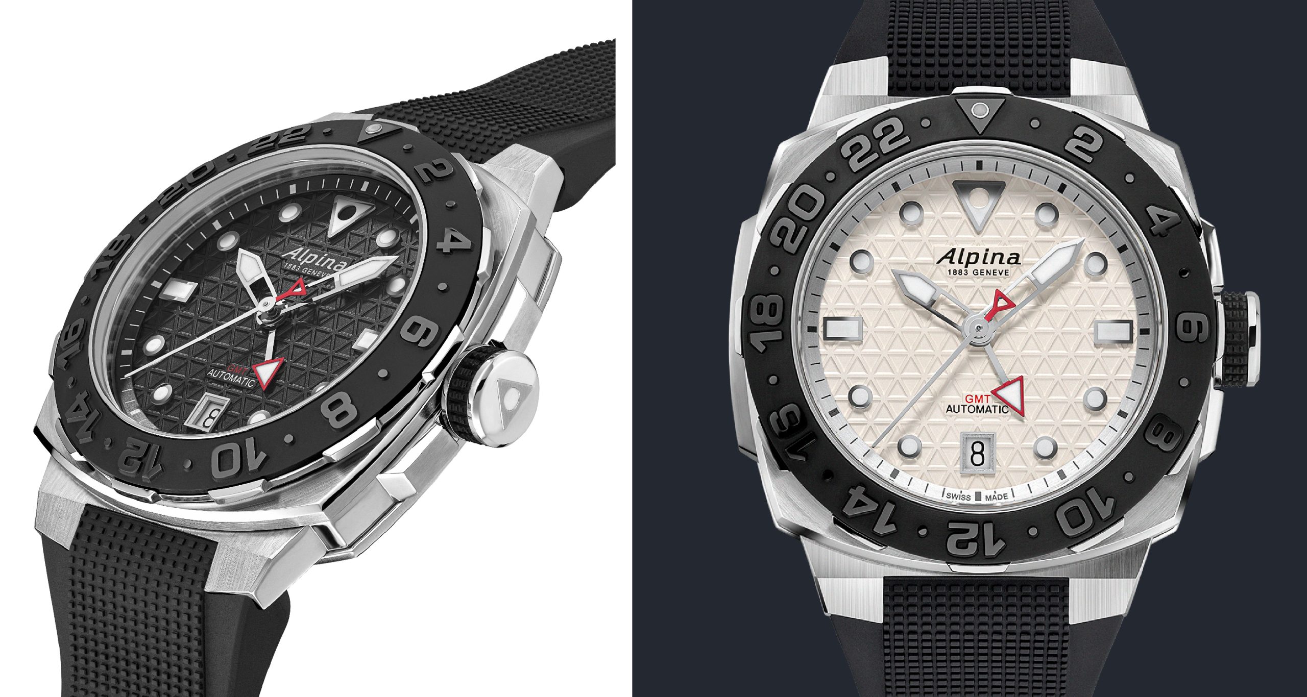 L’automatico GMT ha il quadrante silver oppure nero, sui quali spicca il triangolo tipico di Alpina. La cassa Extreme in acciaio levigato e spazzolato, w.r. a m.300 (spessore 12,65) con fondello a vite, misura 39×40,50 mm, la lunetta unidirezionale in ceramica nera opaca ha cifre lucide e incisione in rilievo, la corona avvitata, dotata di un anello in caucciù per una presa sicura anche con i guanti, comanda le funzioni GMT. Il movimento è il calibro automatico AL-560, riserva di carica 50 h, A/h 28.800 e 25 rubini. Sul quadrante con il triangolo della Marca, indici applicati e lancette luminescenti, quella del II fuso orario termina con un dettaglio rosso, infine cinturino in caucciù tesaurizzato con fibbia deployante con pulsante di sicurezza.