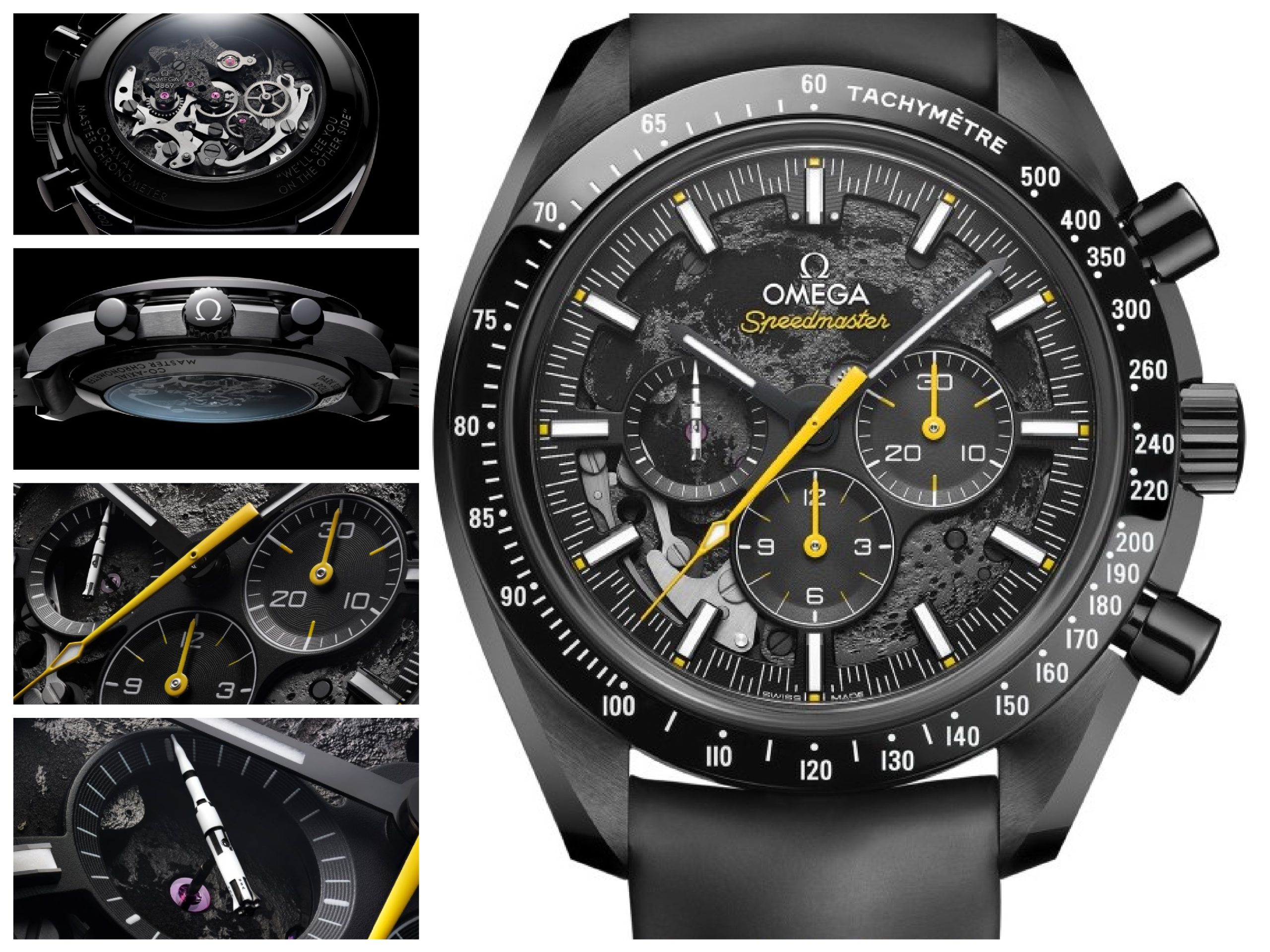Ponti e platina principale sono anneriti. le ruote sono rivestite in grigio chiaro e quella del bilanciere in grigio scuro. Inoltre, sotto il profilo cromatico, sono stati impiegati elementi in ceramica nera per la cassa ø 44,25 mm, il fondello e la lunetta lucida; su questa risalta la scala tachimetrica in smalto Gran Feu bianco. La lancetta della cronografia è gialla come l’interno del cinturino nero in caucciù. Vale la pena di ricordare anche un altro dettaglio: la lancetta dei secondi a ore 9 per la quale è stato domandato il brevetto: ispirata al razzo bianco Saturn V della Nasa, è realizzata in titanio grado 5 in 3D impiegando ablazione e annerimento al laser. Last but not least il movimento, Calibro 3869 a carica manuale, certificato Co-Axial Master Chronometer per standard di precisione cronometrica e resistenza magnetica, con la decorazione a tema lunare.