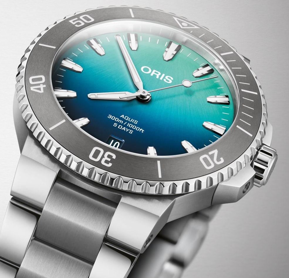 Diverse le modifiche apportate al primo Aquis; questo ha la cassa in acciaio inossidabile ø 43,50 mm, w.r. a m.300, che accoglie il Calibro 400; per la prima volta il quadrante ha una colorazione sfumata che parte da ore 12 per diventare più scura a ore 6, ricordando l’effetto delle acque australiane. Inalterati altri dettagli come la lunetta girevole unidirezionale con inserto in tungsteno grigio, la corona a vite è protetta, indici e lancette trattati Super-LumiNova e infine i sistemi brevettati Oris di cambio rapido e regolazione del bracciale in metallo con fibbia deployante. In quanto al movimento automatico Calibro 400 ricordiamo che le A/h sono 28.800, i rubini 21 e la carica è di 120 h.