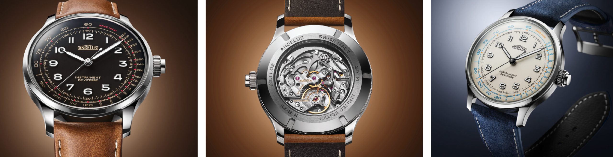 Tornando alle due edizioni presentate da Angelus, in tiratura limitata a 25 esemplari, la cassa in acciaio ø 39 mm con fondo vetro zaffiro, ha uno spessore di 9,27 mm; il vetro zaffiro box protegge il quadrante bombato, nero ebano o bianco avorio, che è diviso in due zone con la scala tachimetrica, graduata da 60 a 500 su base 1.000 e quella centrale destinata alla lettura dell’ora, con una minuteria graduata. Indici applicati e lancette hanno un trattamento superLuminova. Il movimento è il Calibro A5000, meccanico a carica manuale, spessore 4,20 mm, 21.600 A/h, 23 rubini, carica 42 h, platina placata palladio decorata a perlage, ponti placcati palladio smussati e decorati a Côtes de Genève. I cinturini in vitello sono blu sulla versione con quadrante bianco e caramello su quella con quadrante nero.