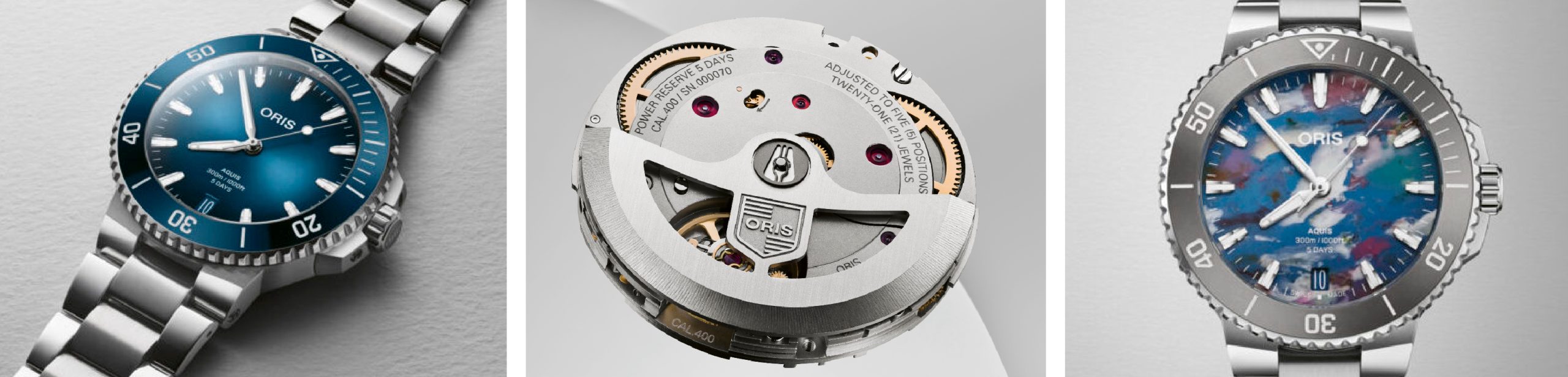 Tornando agli orologi presentati a WandW 2024, pole position per l’Oris Aquis date automatico con quadrante blu, silver o nero, lunetta girevole unidirezionale con inserto in ceramica e cassa in acciaio ø 36,50 w.r. a m. 300, movimento calibro 400 automatico di Manifattura, carica 5 gg,e bracciale in acciaio con sistema rapido di sostituzione. Gli si affiancano gli Aquis Upcycle con cassa ø 43,50 mm che custodisce il Calibro 400 di Manifattura e quelle ø 43,50 mm, 41,50 mm e 36,50mm nelle quali è inserito invece il Calibro 733 automatico Swiss Made su base Sellita.