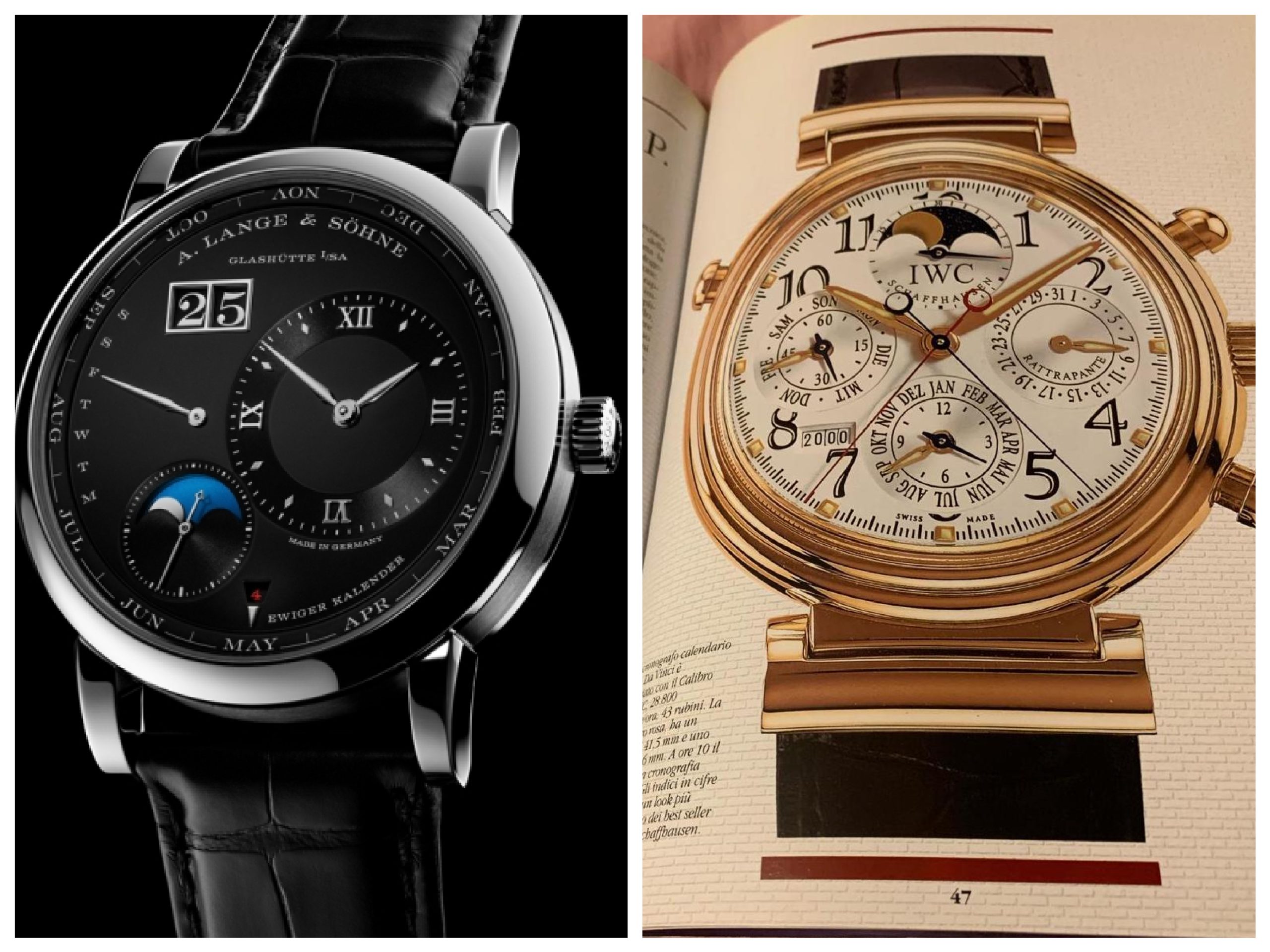 A questi vanno aggiunti, secondo noi, altri due orologi che, sulla rivista cartacea orologi da POLSO, sono stati presentati nella prima metà del 2000: l’I.W.C Da Vinci crono Q.P. ø 41,5 (allora sembrava fin troppo grande), che per primo mostrò l’anno con le 4 cifre dalla finestrella fra le 7 e le 8, la finestrella della luna a ore 12 mostrava anche i piccoli secondi, i mesi erano a ore 6, la data alle 3 e il giorno alle 9. Sempre in quel periodo il Glashütte Original Senator Klassik (cassa in oro ø 39 mm e movimento automatico di Manifattura Calibro 39) scelse finestrelle abbastanza simmetriche per giorno e mese alle 9 e alle 3, data panoramica a ore 4 e fasi di luna da una finestrella che aveva la forma del quarto di luna.