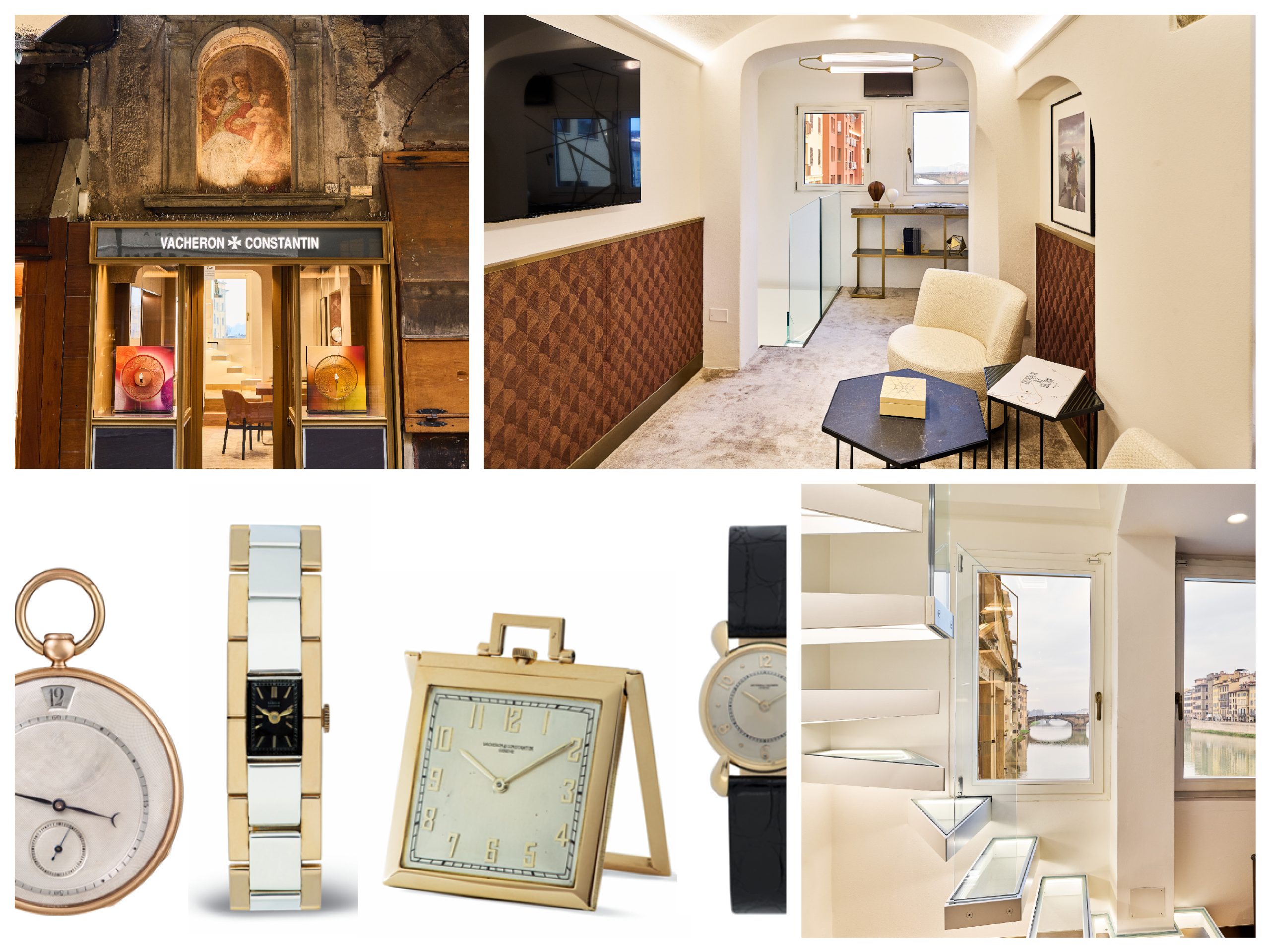 Nella foto l’ingresso della boutique sovrastato da un tabernacolo con l’immagine seicentesca della Vergine che benedice i passanti, l’interno con una scala in vetro, le finestre affacciate sull’Arno e una zona riservata per clienti VIP. I quattro orologi fotografati rappresentano la varietà di stili e di proposte che la Maison è stata in grado di offrire nel XX Secolo riproponendo anche modelli dei secoli precedenti. La collezione Heritage della Maison ginevrina conta circa 1600 esemplari ed è lo specchio dell’abilità dei maestri orologieri e della capacità dei suoi stilisti di adeguarsi all’evolversi del gusto mantenendo alta l’abilità propria della tecnica orologiera.