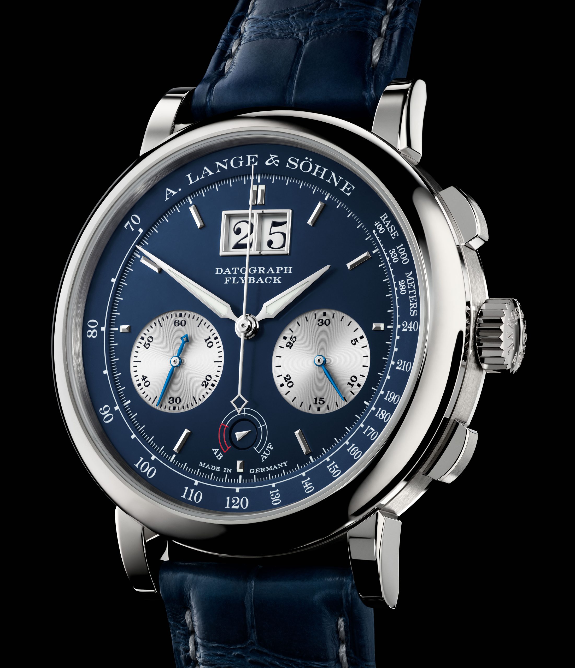 Venticinque anni fa al S.I.H.H. ginevrino 1999, A.Lange & Sohene presentava il Datograph con il Calibro di Manifattura L951.1 dotato di ruota a colonne, flyback, contatore dei minuti saltante e Gran Data; all’attuale WandW il Datograph è arrivato nella versione Up-Down in oro bianco, ø 41 mm e spessore 13,1 con quadrante blu, ma anche in platino e in oro rosso, con riserva di carica 60 h, realizzato in 125 esemplari.