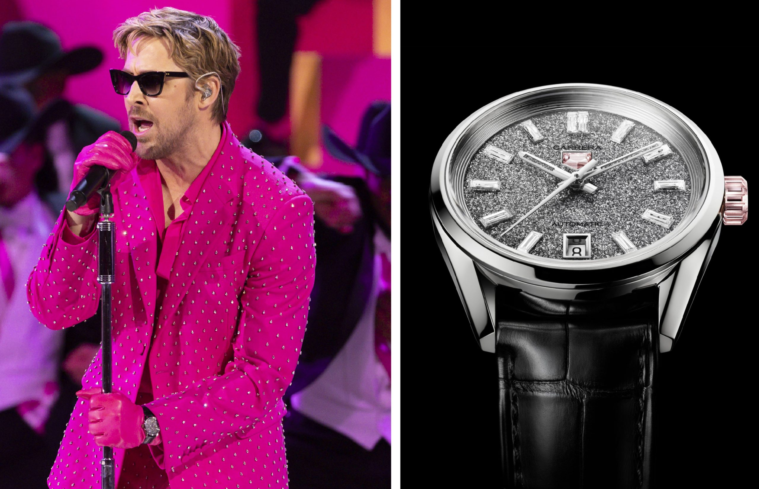 Ryan Gossling, Ambassador di TAG Heuer aveva al polso un Carrera Plasma Diamand d’Avangard, con quadrante, cassa e corona impreziositi da diamanti coltivati in laboratorio ed è stato molto applaudito quando, interpretando il ruolo di Ken, ha cantato la canzone di Barbie ‘I’m just Ken’ vestito con un scintillante completo rosa. Il Carrera Plasma Diamond è stato realizzato nel 2023 per il 60° anniversario del Carrera, al suo interno c’è il Calibro 7 automatico di manifattura.