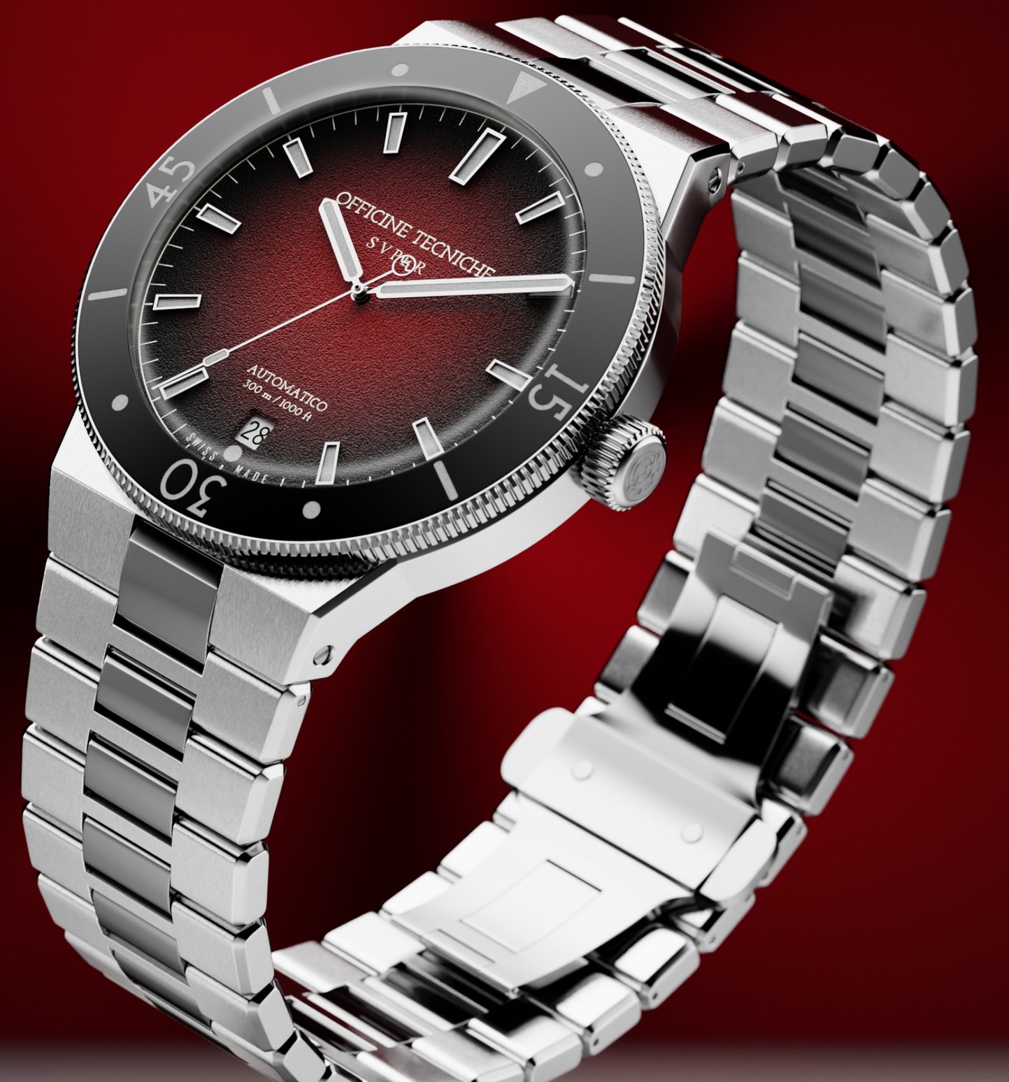 OFFICINE TECNICHE : questo orologio arriva dalla Puglia, dove due amici appassionati di immersioni subacquee quanto dell’orologeria meccanica, nel 2019 hanno fondato il Marchio e presentato iil diver Super, disponibile in cinque versioni (con altrettanti colori per il quadrante) dedicate a cinque zone pugliesi delle quali propongono il nome (Arpi, Gargano, Rodi, San Domino, Varano; per chi al Nord non lo sapesse, Arpi è l’antico nome di una città fondata vicino a Foggia dove è nata l’idea di produrre questo orologio). Nella cassa in acciaio 316L ø 40 mm w.r. a m.300 con lunetta girevole unidirezionale 120 click e inserto in ceramica lucida o opaca, è custodito il Calibro La Joux-Perret LJP-G100, versione Top Grade A012 Swiss Made, con massa oscillante in tungsteno viti azzurrate, finiture diamantate e a Côtes de Genève, riserva di carica 68 h; corona e fondo a vite in acciaio 316L con logo e incisioni a conio; il colore rubino è degradé; il bracciale integrato in acciaio ha la fibbia a farfalla e può essere sostituito facilmente.