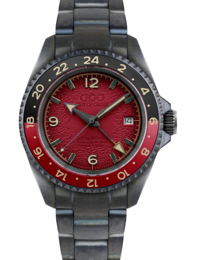 OUT OF ORDER: è nuovissima la versione GMT del modello Trecento, diver a m.300 presentato l’estate scorsa, con quadrante sabbiato rosso rubino opaco lavorato a soleil con indici applicati ruggine stabilizzato (altro procedimento brevettato da OOO). Cassa ø 40 mm e bracciale entrambi in acciaio 316L invecchiato trattato IP gun con procedimento brevettato, fondo a vista per vedere il movimento automatico Swiss Made riserva di carica 40 h. Sull’anello del fondo una frase in italiano, inglese e latino: è il motto scelto quando OOO è stato fondato: “Fai dei tuoi difetti le tue virtù – Let your faults become your beauty – Age ut tua vitia fiant tua vis”. Infine una curiosità. L’edizione è in tiratura limitata a 47 esemplari, un numero formato da 4, sinonimo di responsabilità, produttività, buona organizzazione e determinazione e 7 che comunemente viene associato anche all’intuizione ed alla memoria. Potremmo quasi dire che non è solo un diver ma anche un Tutor…
