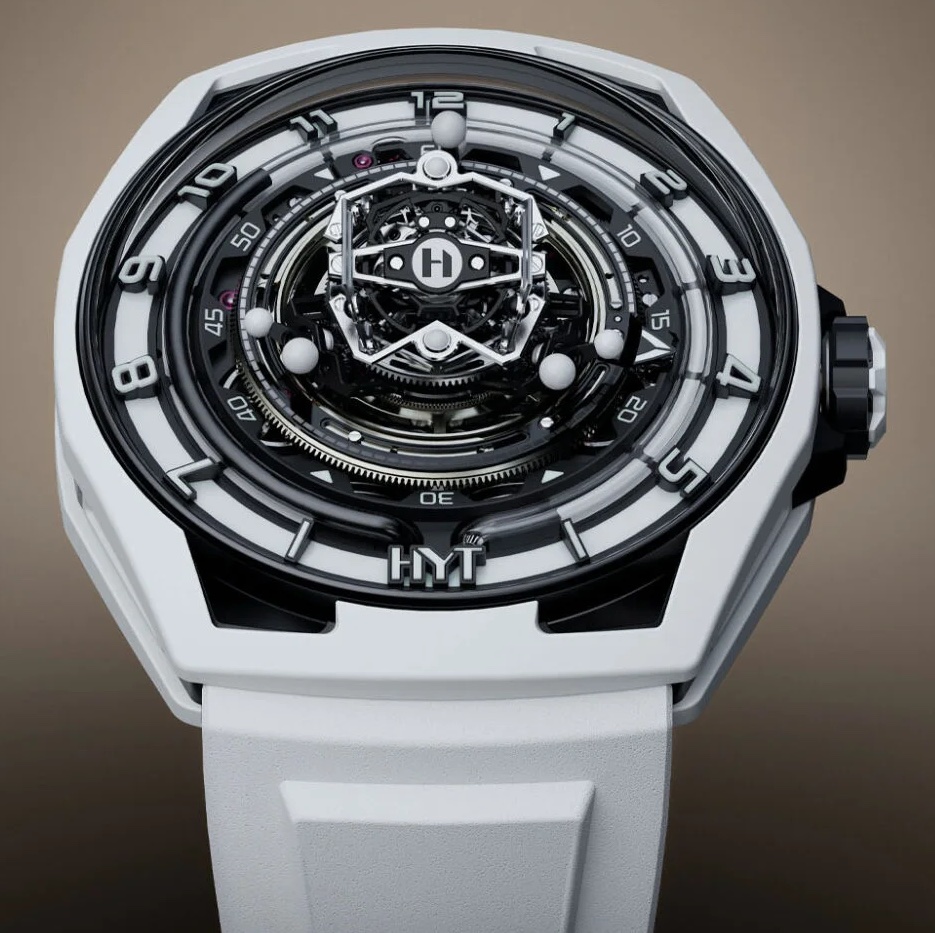 Il quadrante bianco e nero che ricorda il panda, continua a piacere, lo ha adottato anche HYT, per la sua più recente novità della primavera 2024 nella quale ha affiancato il movimento hydromeccnaico allo scappamento a tourbillon.