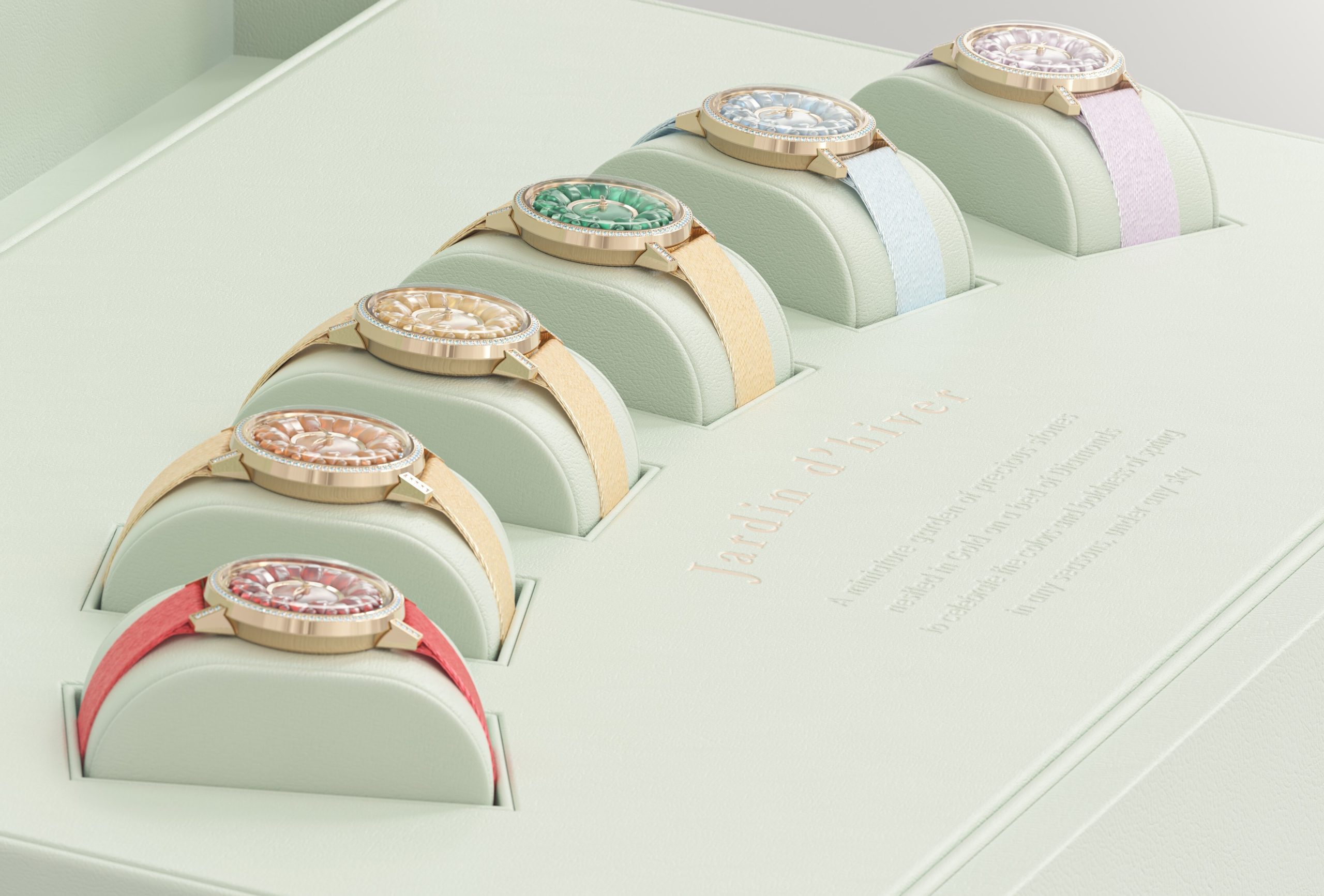 Quattro orologi conducono in un fantastico viaggio intorno al mondo con l’Opale giallo Brasiliano, il Chrysopazio dell’Australia, il Topazio dell’Arizona e l’Ametista del Perù; gli ultimi due, lavorati per la prima volta e riservati alla confezione annuale, sono i rarissimi Opale di fuoco e il Fanta Opal estratti dalle montagne Chiapas nel Messico. Ogni Lily Bouton, che ha in oro le lancette, è presentato in uno scrigno, sei formano l’unico set completo disponibile nel corso dell’anno. Infine i cinturini in satin, con fibbia ad ardiglione in oro 19 carati, sono anch’essi prodotti in Svizzera.