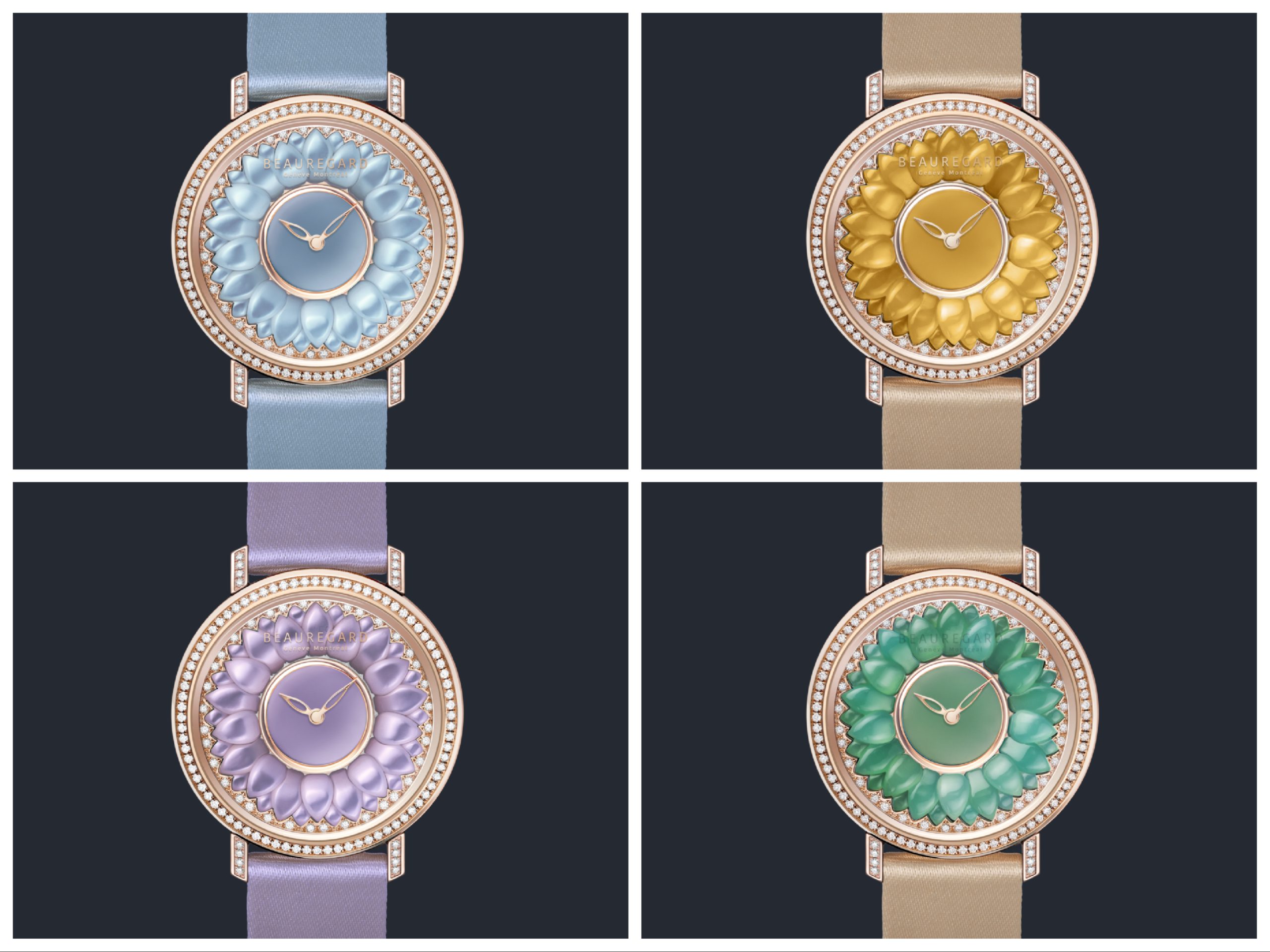 Preview of Beauregard haute jewellery Lily Bouton watches, rose gol case o 33 mm and stone flowers on dials.