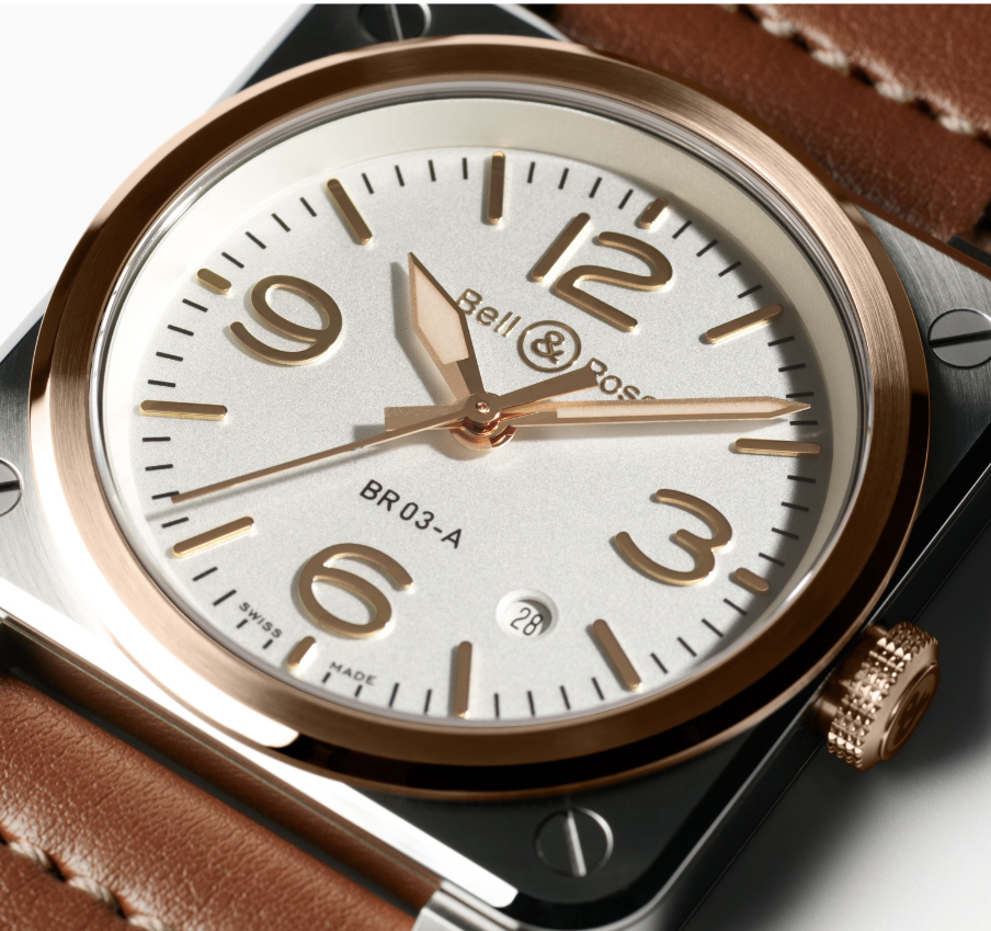 Steel & gold for the new elegant version of BR 03, ø 41 mm, with a fine white opaline dial and self-winding movement.