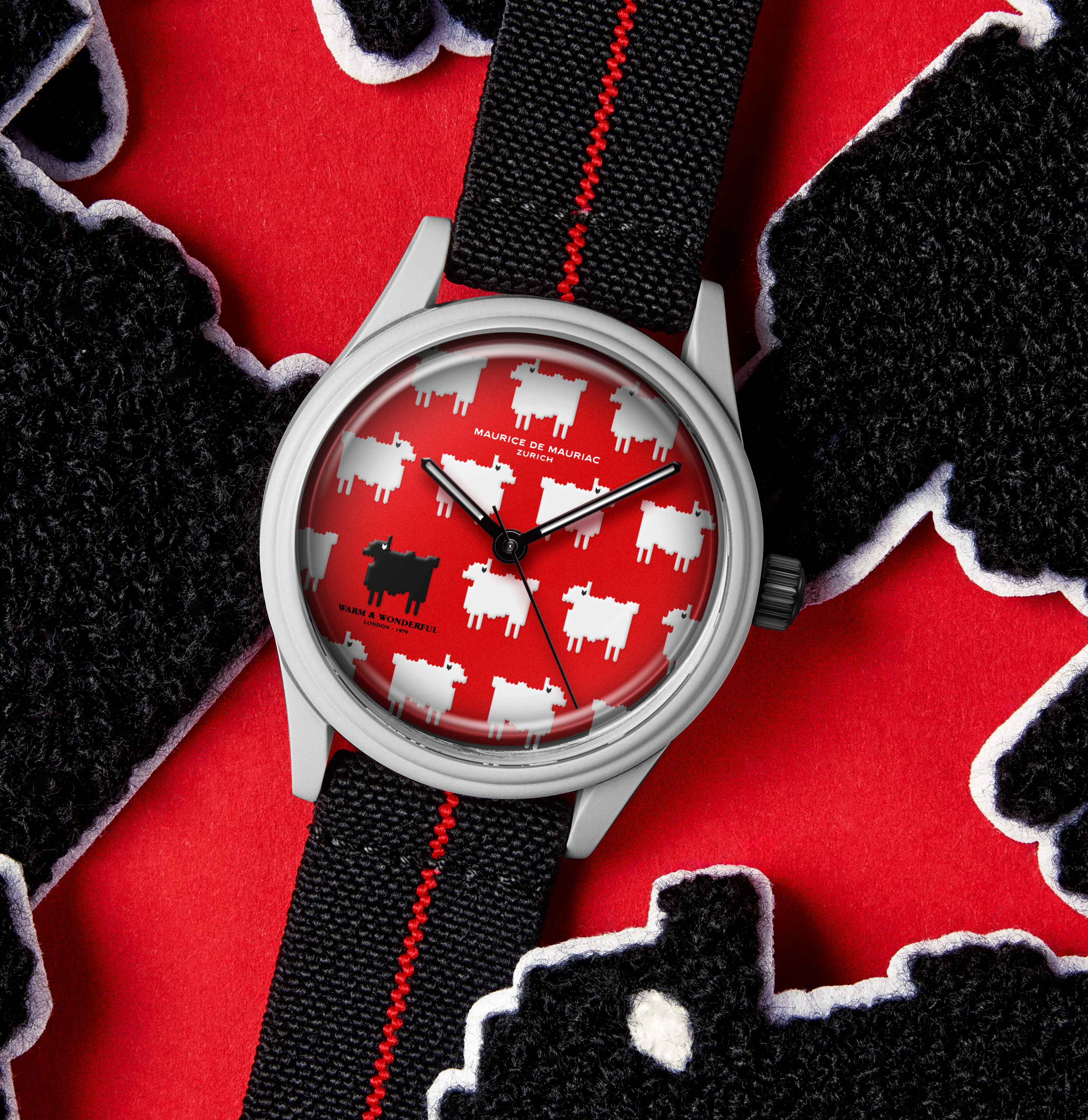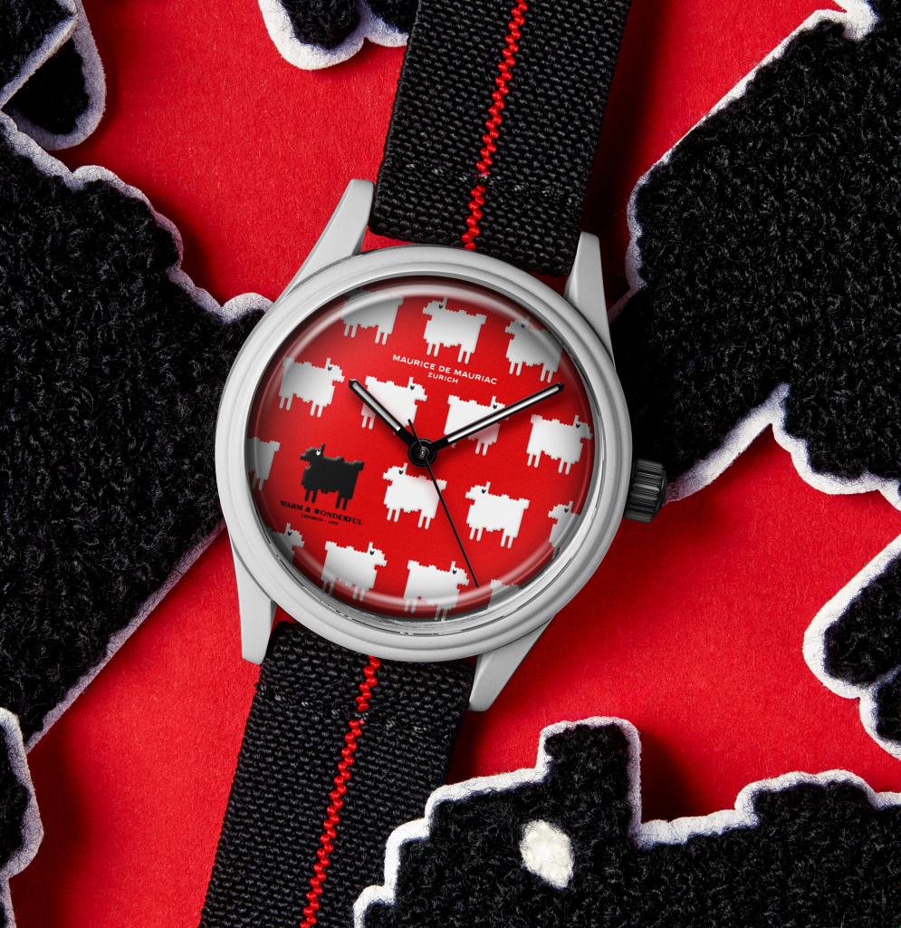 Questi i dettagli orologieri: cassa, ø 39 mm, spessore mm 12 in acciaio inossidabile, w.r. m.100, trattata ceramica bianca Cerakote®, sulla corona levigata PVD black il disegno della pecora; sul retro a vista si vede il movimento svizzero Landeron 24 automatico, 25 rubini, A/h 28.800, riserva di carica 40h. Sul quadrante rosso il doppio logo Maurice de Mauriac e Warm & Wonderful, 15 pecore bianche e una sola nera; lancette e indici trattati Swiss Super-LumiNova® SLN White X1/BL; cinturino in tessuto in due pezzi, uno nero con una riga centrale rossa e uno bianco con riga centrale rossa, entrambi facilmente intercambiabili. Infine nella confezione un badge Black Sheep da cucire su un maglione.