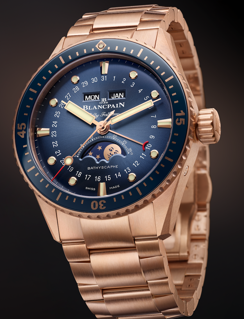 Il Fifty Fathoms, icona della Marca elvetica, nel 2024 festeggiando il LXX Anniversario, ha realizzato nuove versioni, le più recenti sono i Bathyscaphe Quantième Complet e Chronographe Flyback con due bellissimi quadranti e la cassa in oro rosso.
