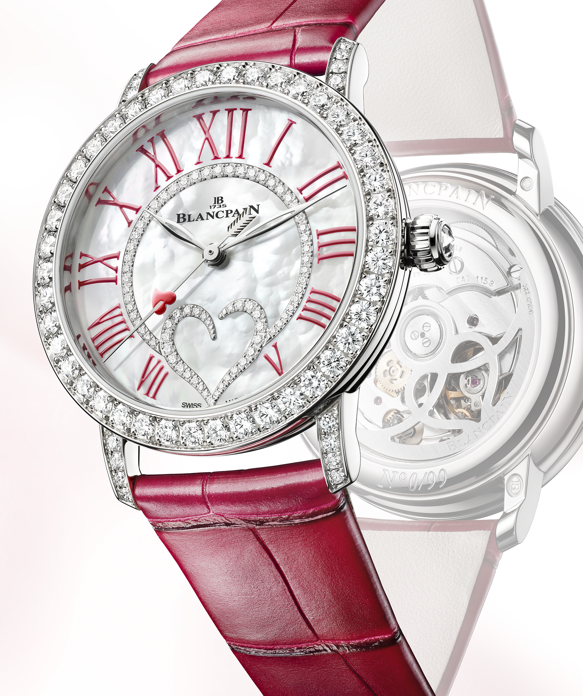 La cassa del Valentineìs Day di Blancpain è in oro bianco ø 34,90 mm (spessore mm 9,20 e fondo in vetro zaffiro) ed è impreziosita su lunetta e anse da diamanti taglio brillante, incastonati dal Maestro gioielliere; quello sulla corona ha un taglio a rosa; in totale le pietre preziose superano i due carati. Sul quadrante in madreperla di una varietà esclusiva gli indici sono in cifre romane rosse ottenute con cinque applicazioni separate di colore; a ore 6, come in tutti i Ladybird c’è un anello d’oro che nel Valentine’s Day ha la forma di un cuore prezioso con diamanti di misure diverse. Completano la grafica mirata affusolate lancette d’oro a foglia per ore e minuti, mentre quella del secondi attraversa un cuore rosso, il contrappeso ha la forma di una piuma.