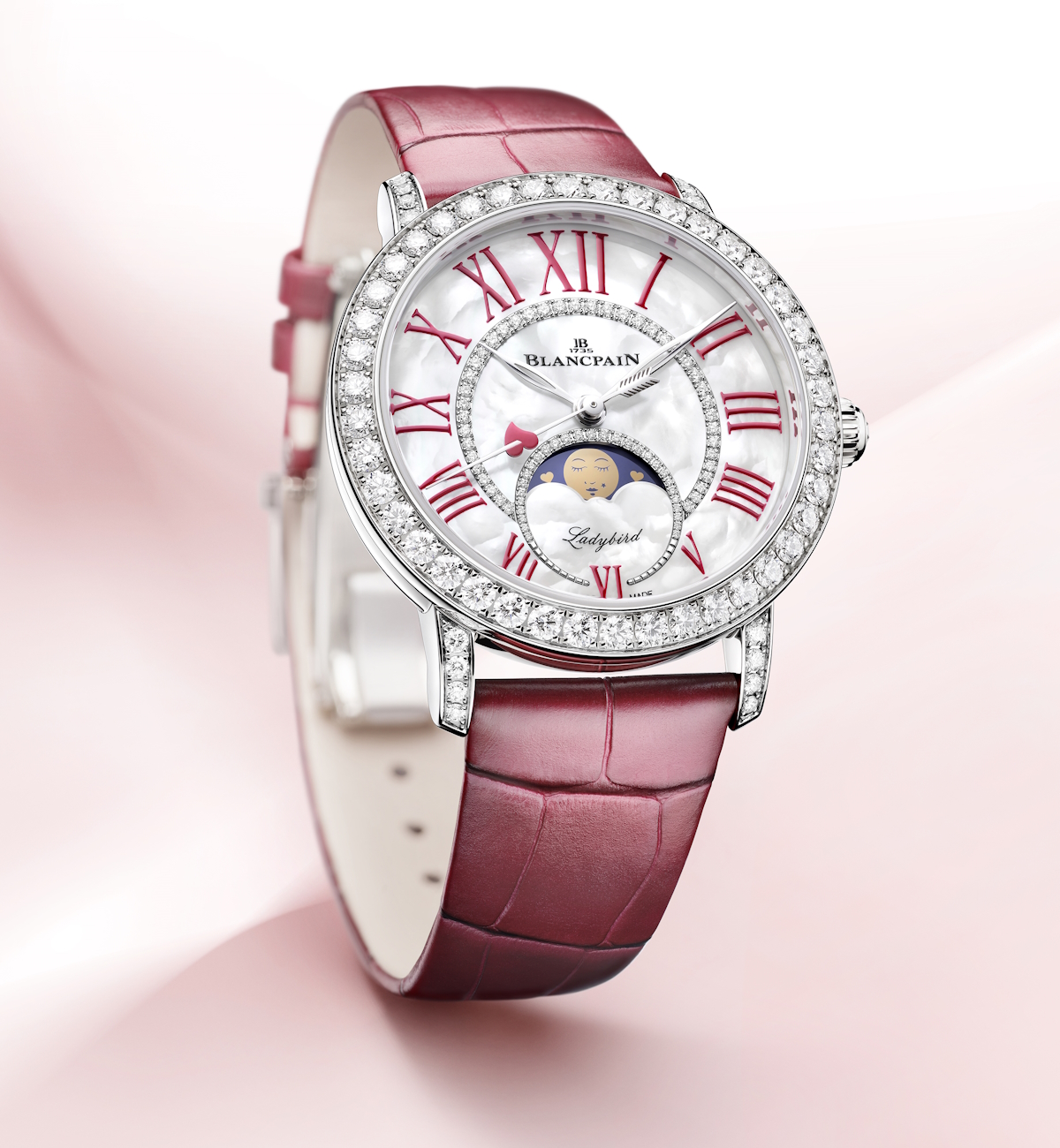Terminate queste brevi informazioni astronomiche, augurandoci che per quelle a venire il cielo non sia coperto da nuvole, torniamo al Blancpain di S.Valentino per dire che nel Ladybird Colors 2025 le fasi di luna sono dorate e, come da tradizione, mostrano tratti femminili (occhi chiusi con lunghe ciglia, labbra carnose e un neo all’angolo della bocca) su una nuvola di madreperla bianca.